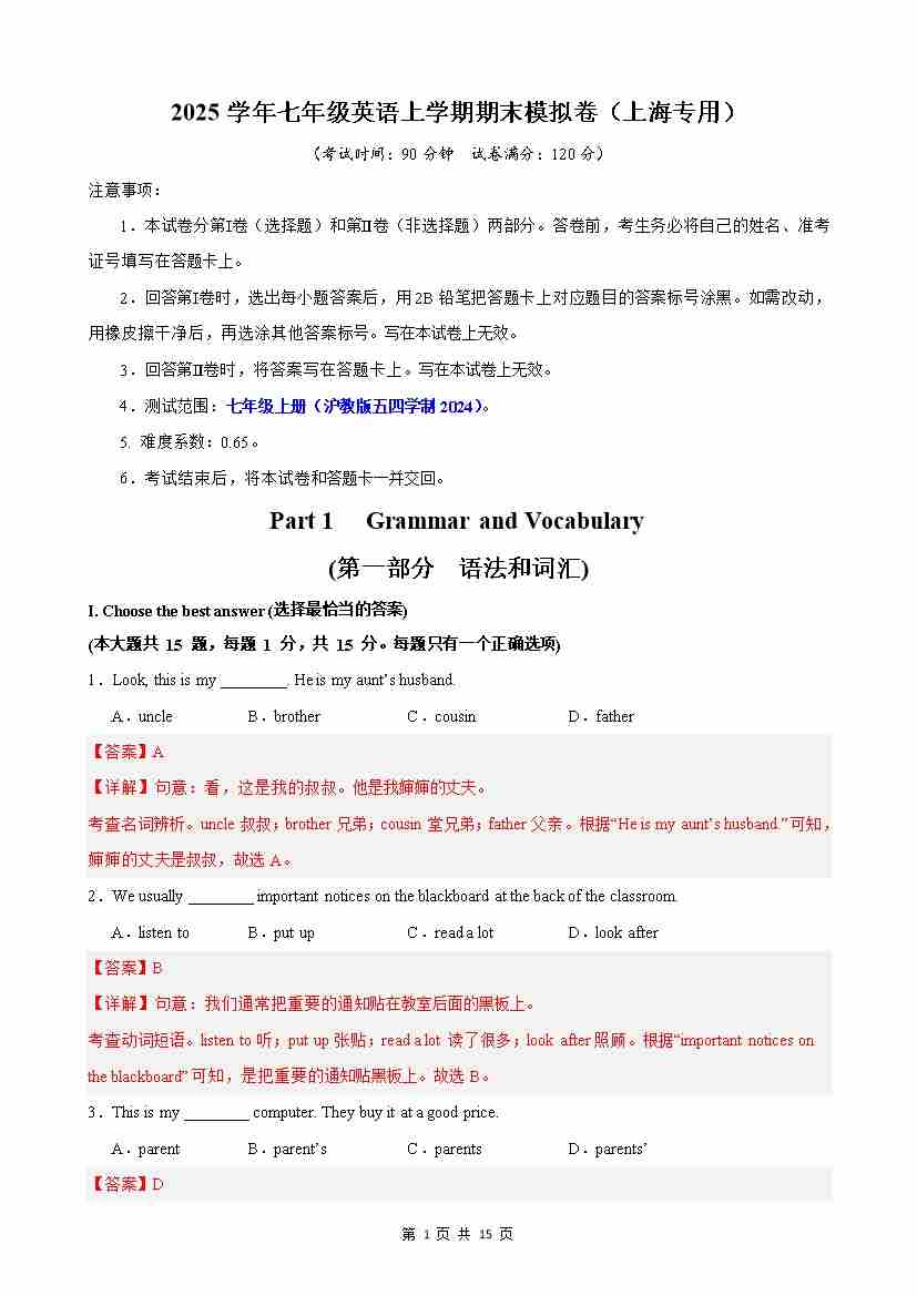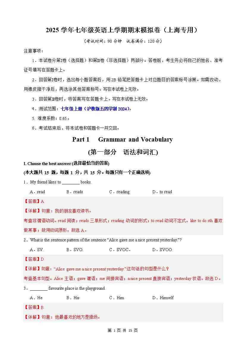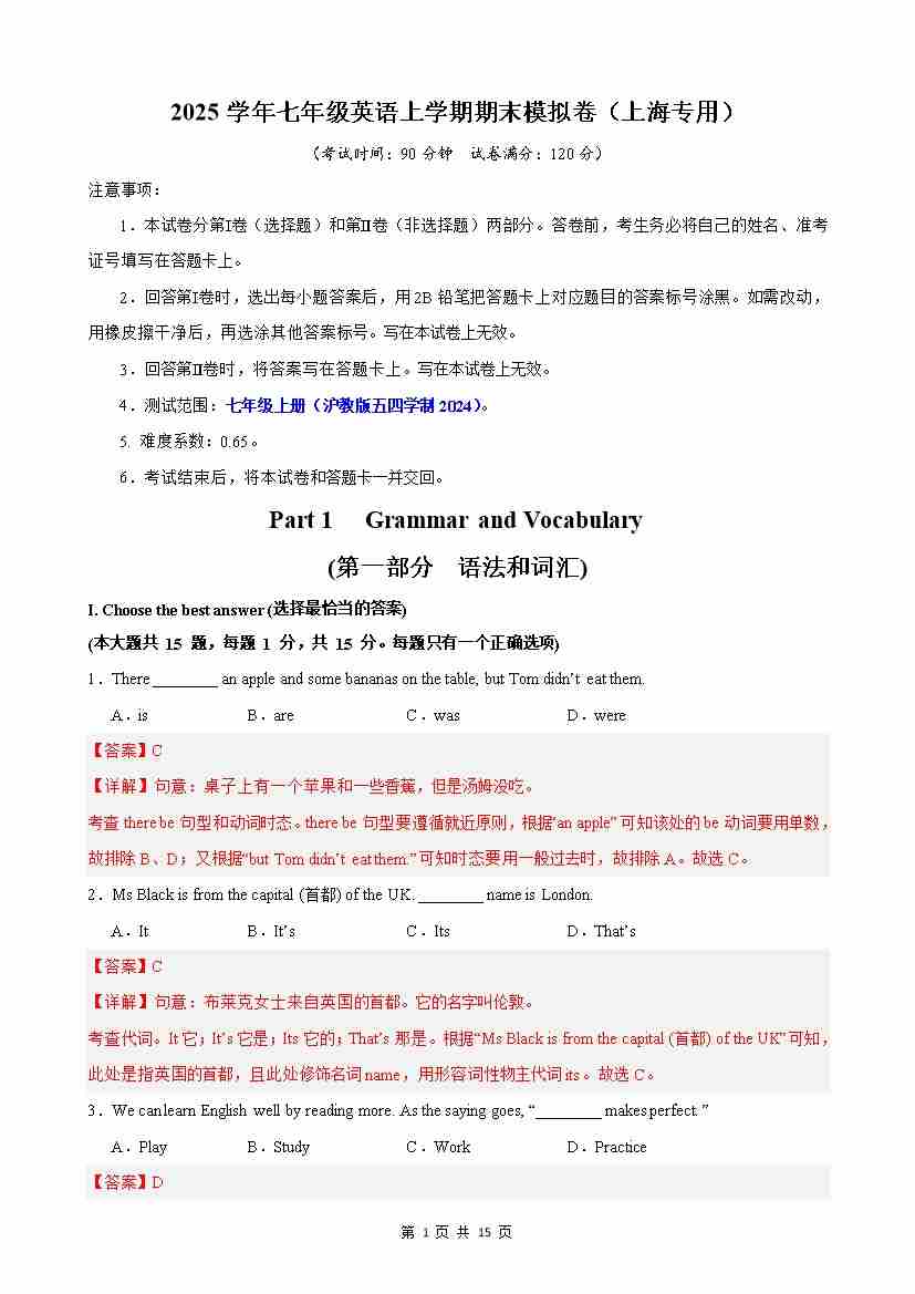 期末押题卷01(解析版)沪教54版