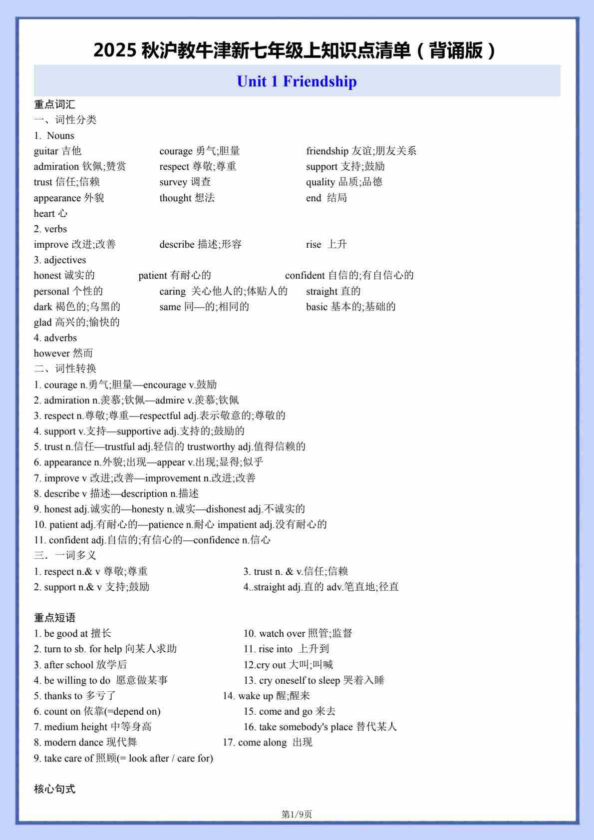 2025版沪教牛津新七年级上知识点清单(背诵版)