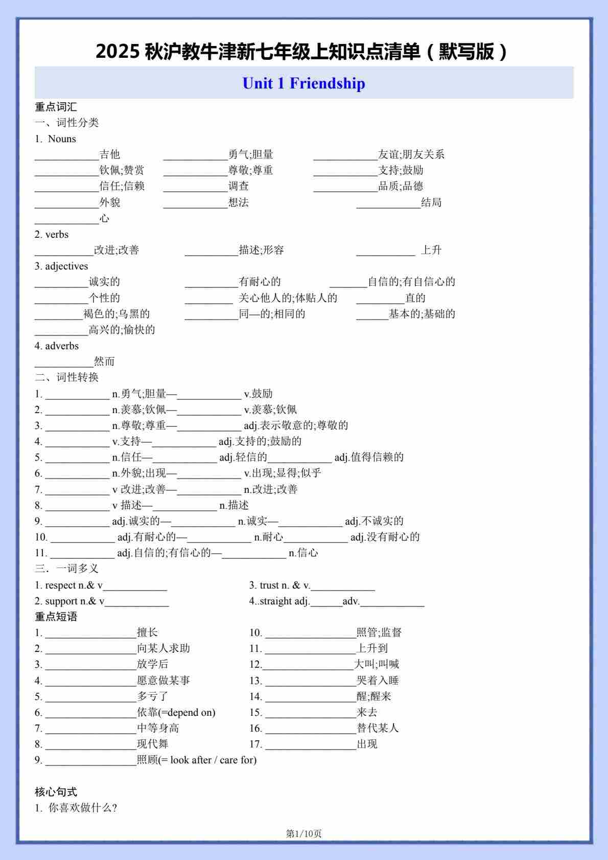 2025版沪教牛津新七年级上知识点清单(默写版)