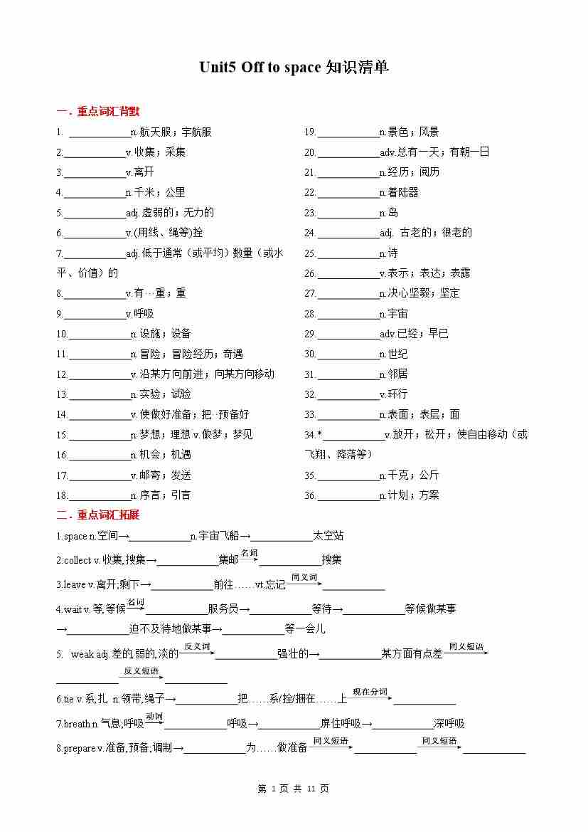 5.新牛津版Unit5 Off to space知识清单(默写版)