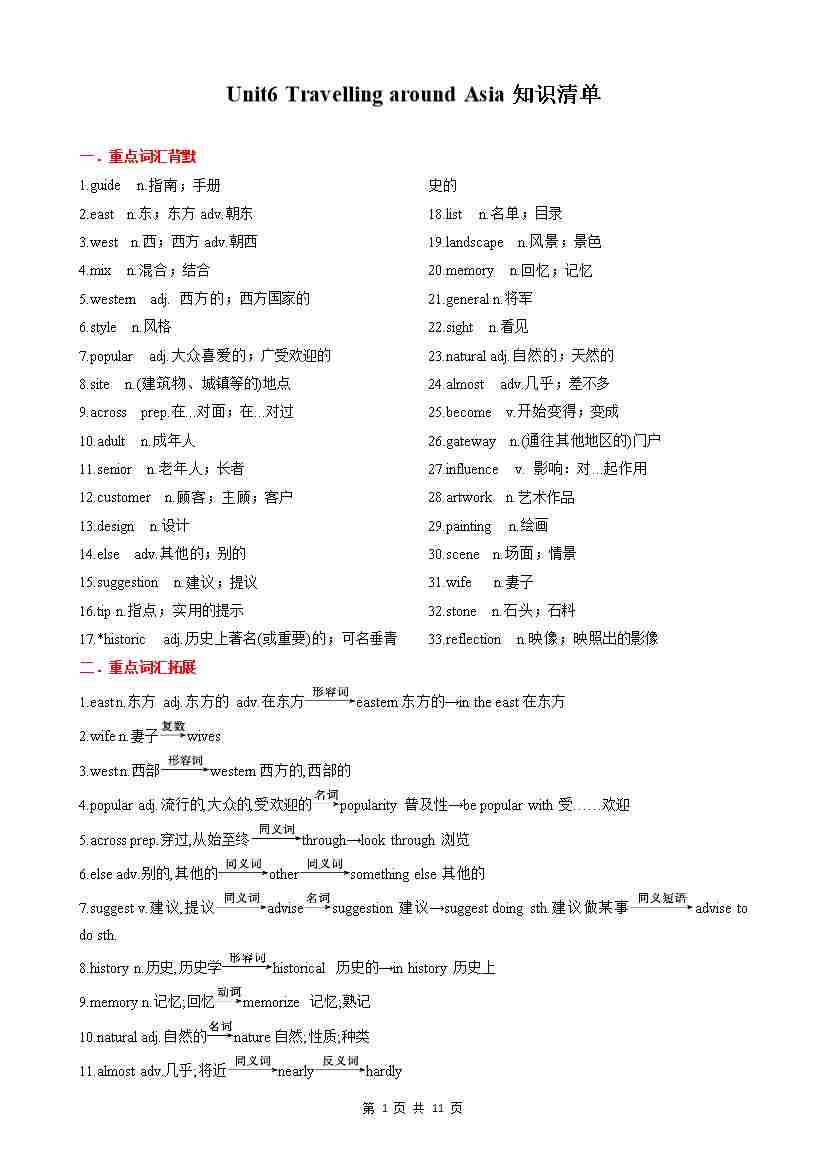 6.新牛津版Unit6 Travelling around Asia知识清单(背诵版)