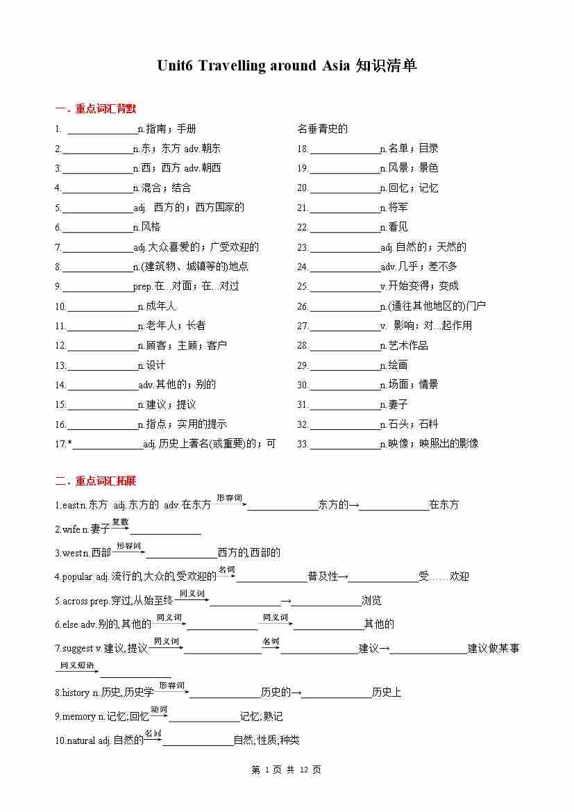 6.新牛津版Unit6 Travelling around Asia知识清单(默写版)