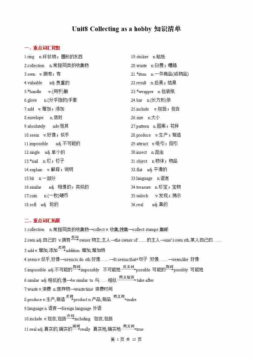 8.新牛津版Unit8 Collecting as a hobby知识清单(背诵版)