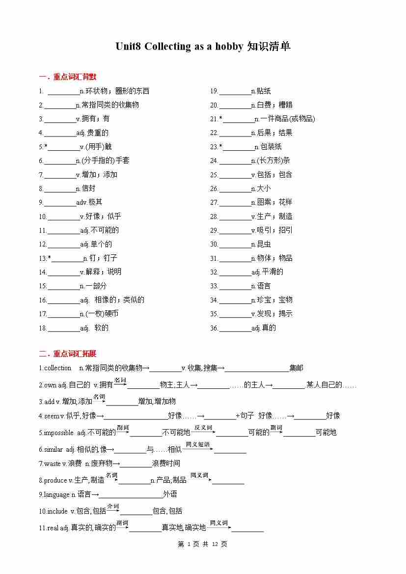 8.新牛津版Unit8 Collecting as a hobby知识清单(默写版)