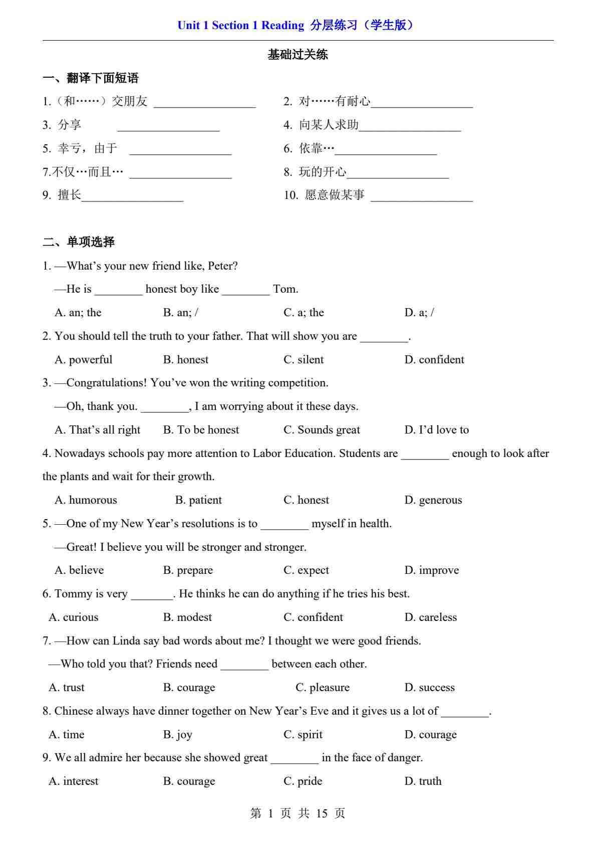 Unit 1 Section 1 Reading(分层练习)沪教版