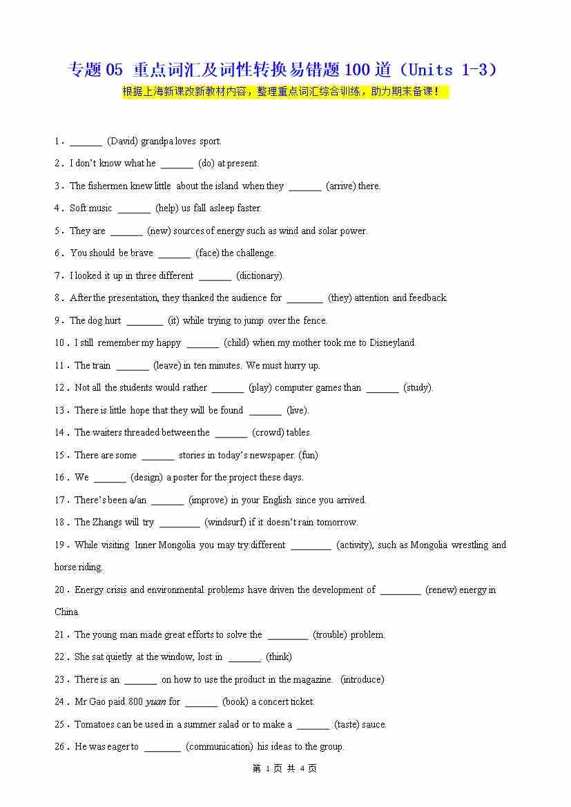 专题05 重点词汇及词性转换易错题100道(Units1-3)(原卷版)