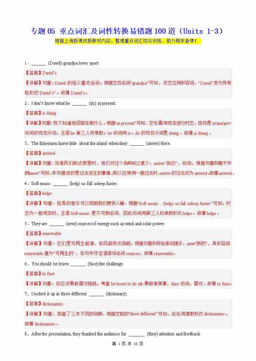 专题05 重点词汇及词性转换易错题100道(Units1-3)(解析版)