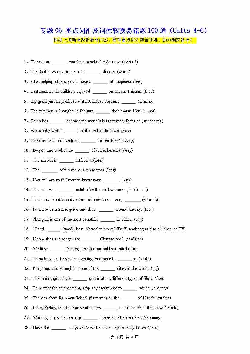 专题06 重点词汇及词性转换易错题100道(Units4-6)(原卷版)