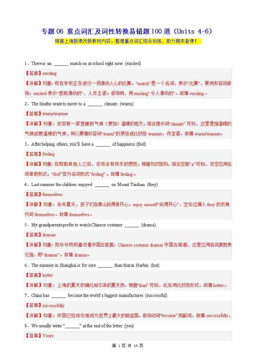 专题06 重点词汇及词性转换易错题100道(Units4-6)(解析版)