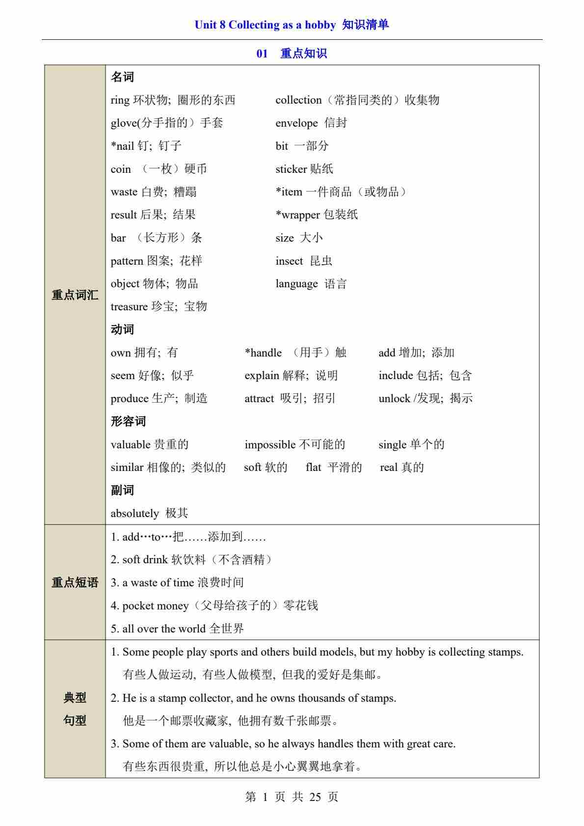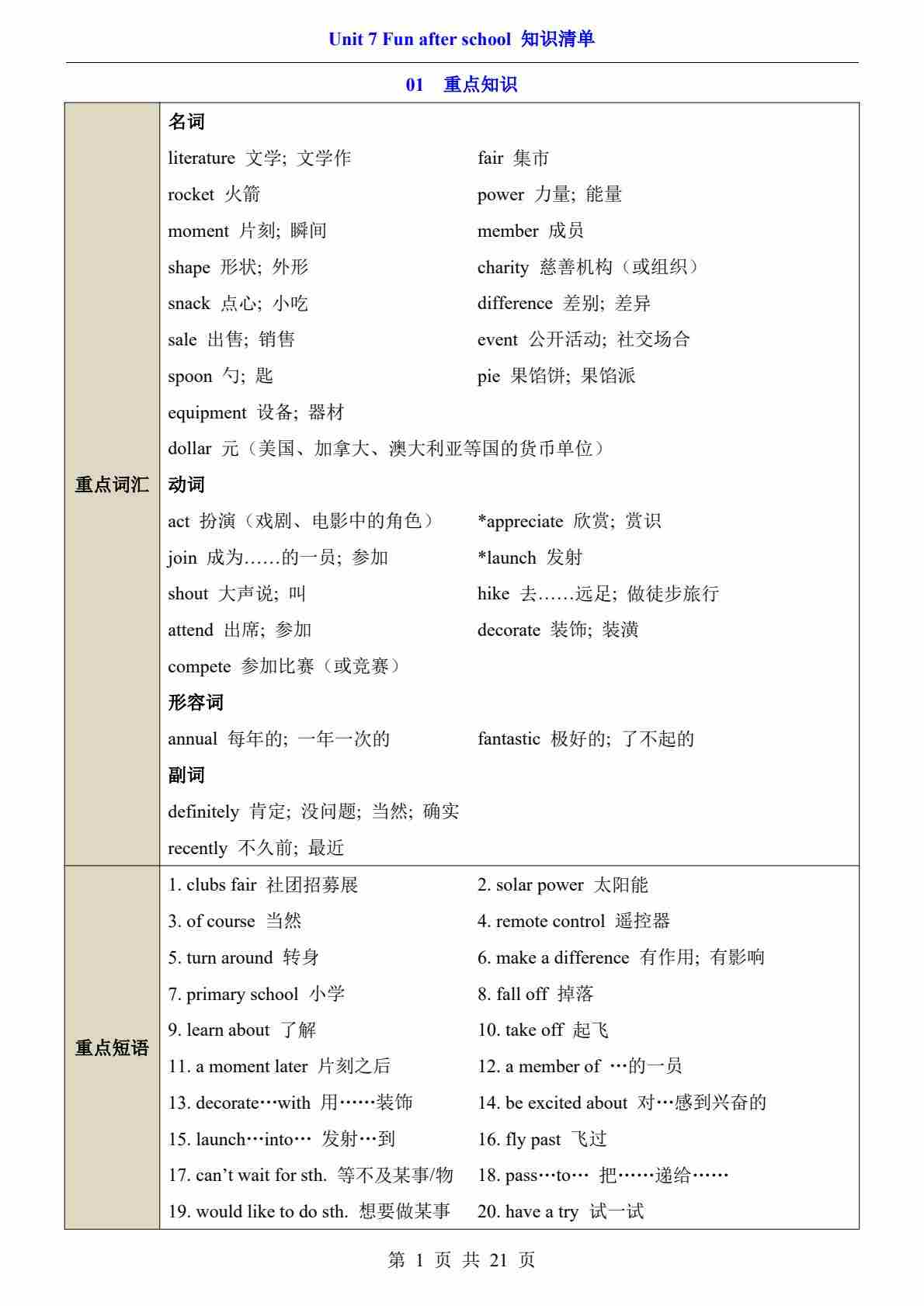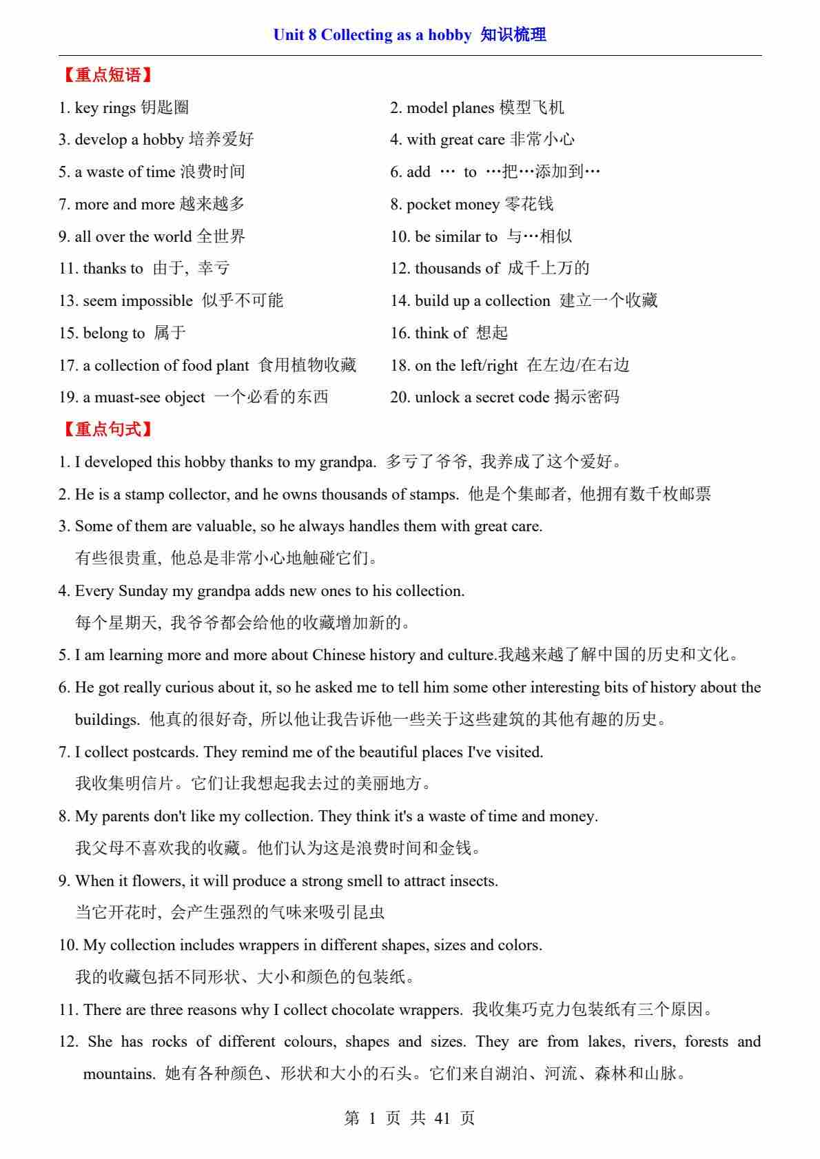 2025七年级英语上册重点短语和知识2025学年沪教牛津版Unit1-Uni8