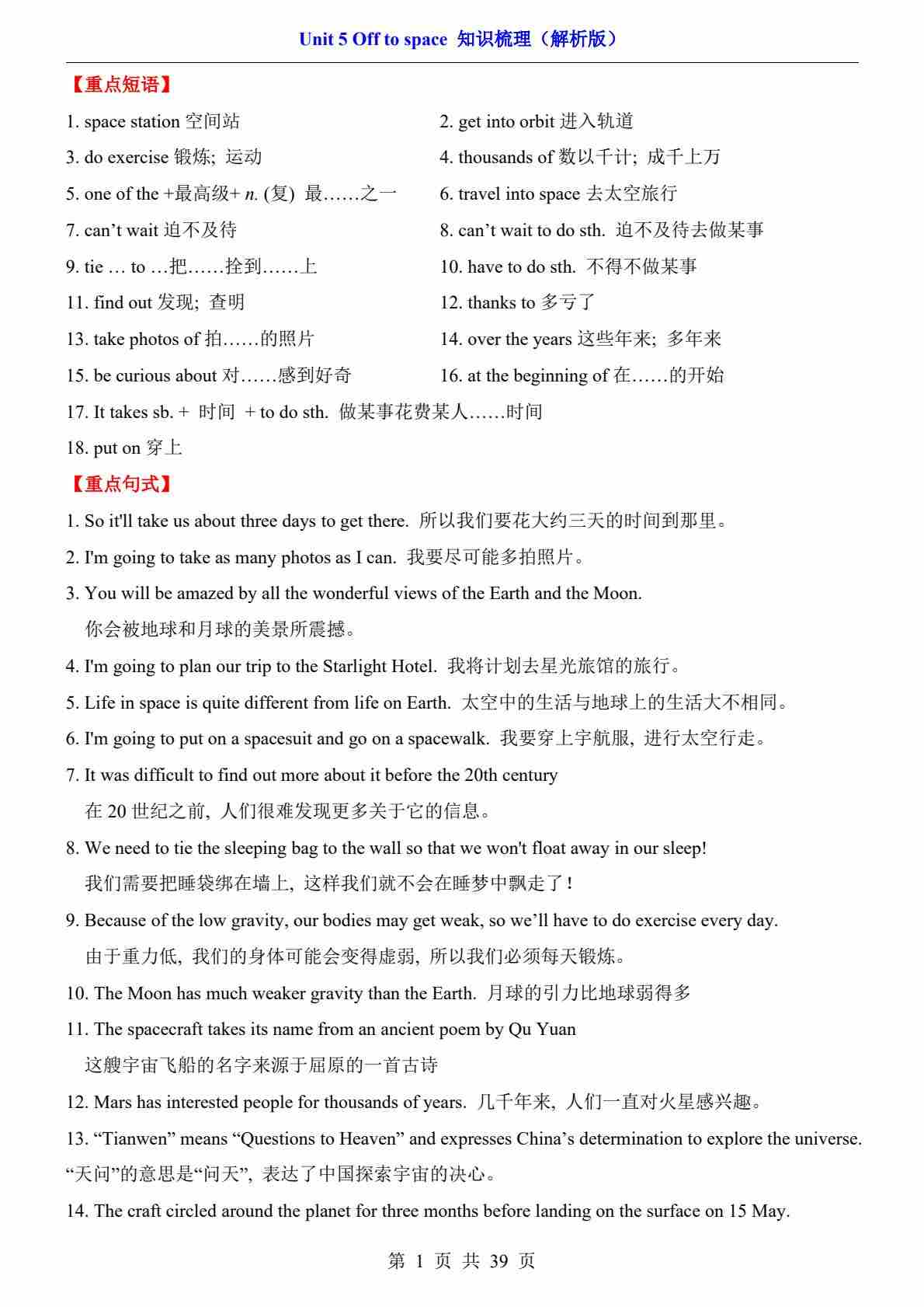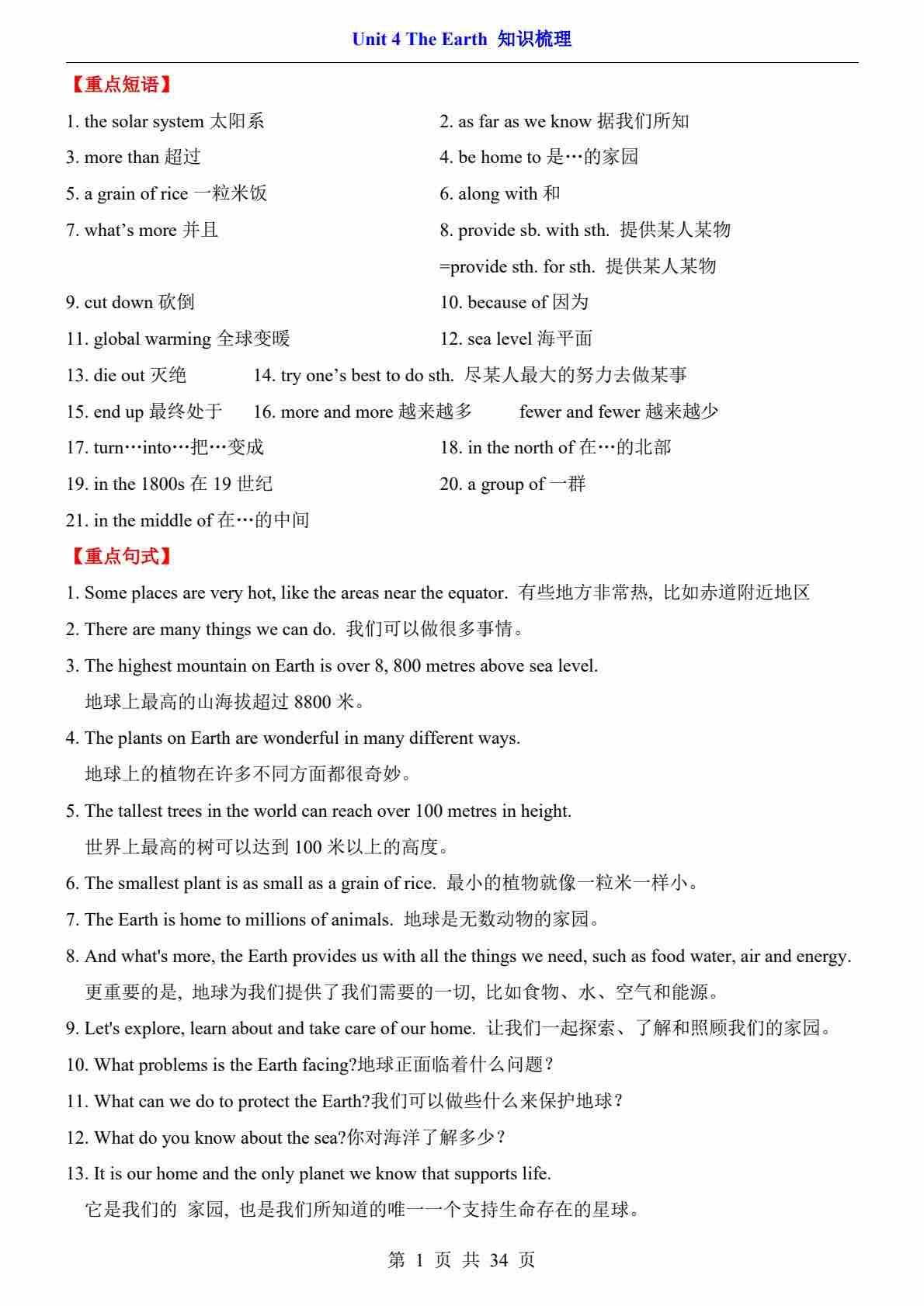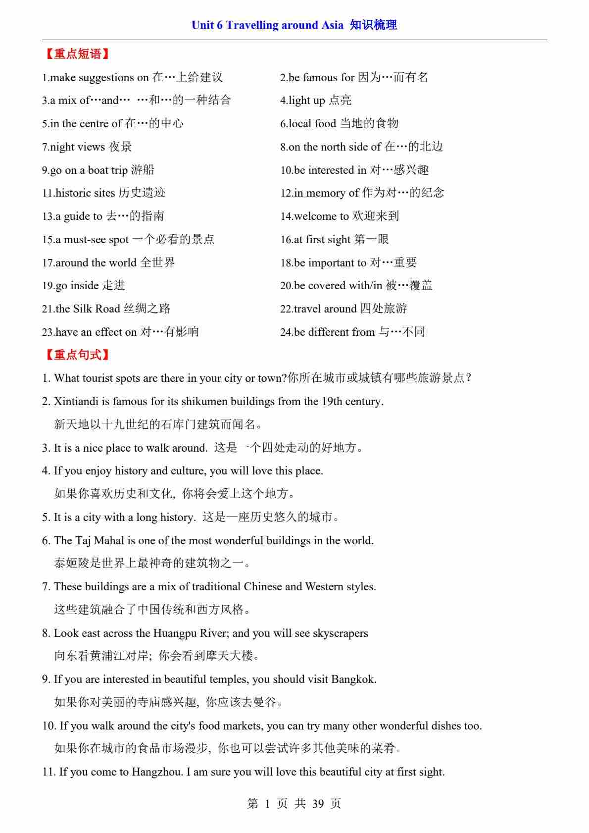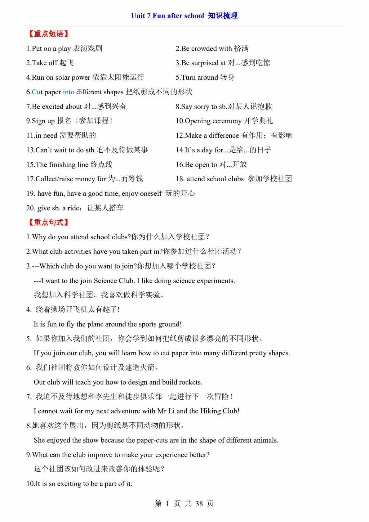 2025七年级英语上册重点短语和知识2025学年沪教牛津版Unit1-Uni8