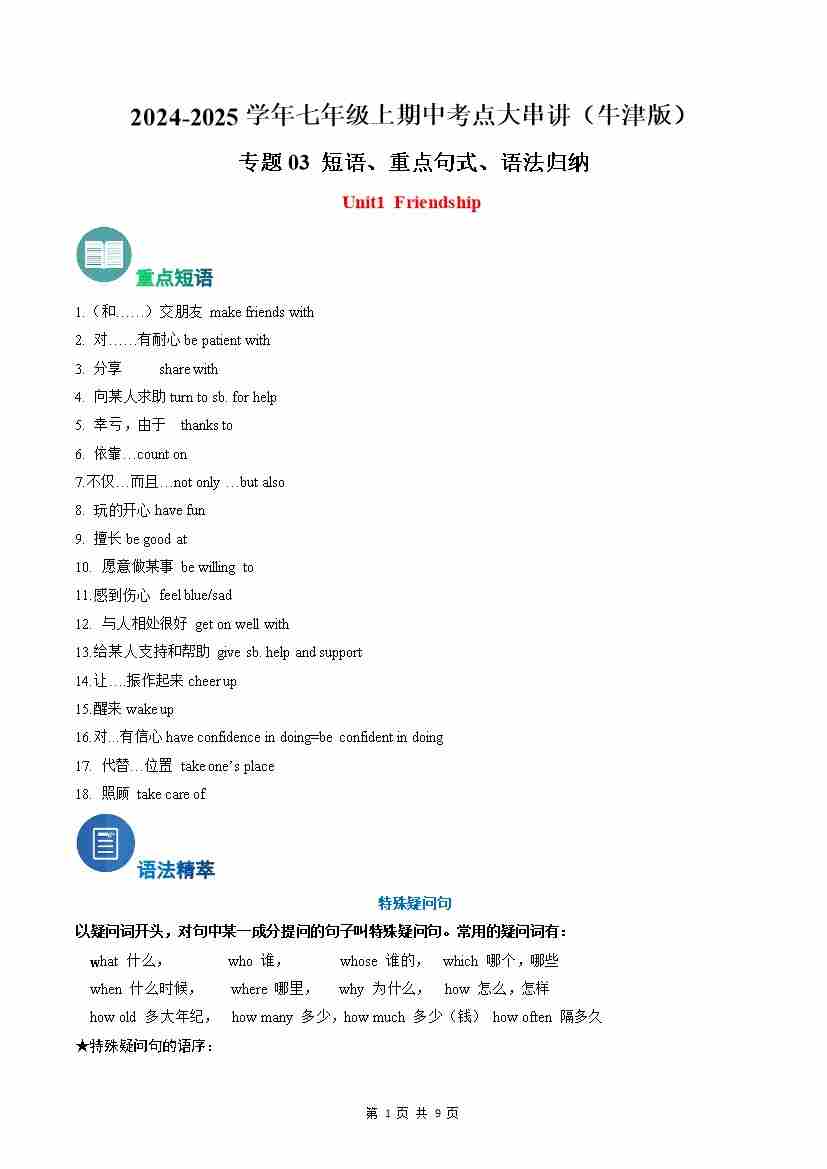 专题03 单词,短语,语法归纳【考点清单】-2024-2025学年七年级英语上学期期中考点大串讲(沪教版2024)
