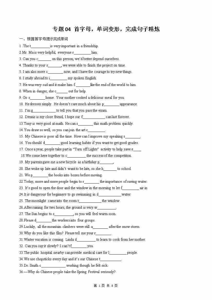 专题04 首字母,单词变形,完成句子精练【考题猜想】(原卷版)