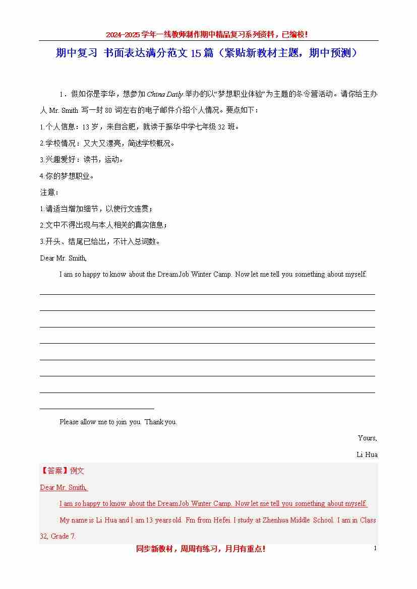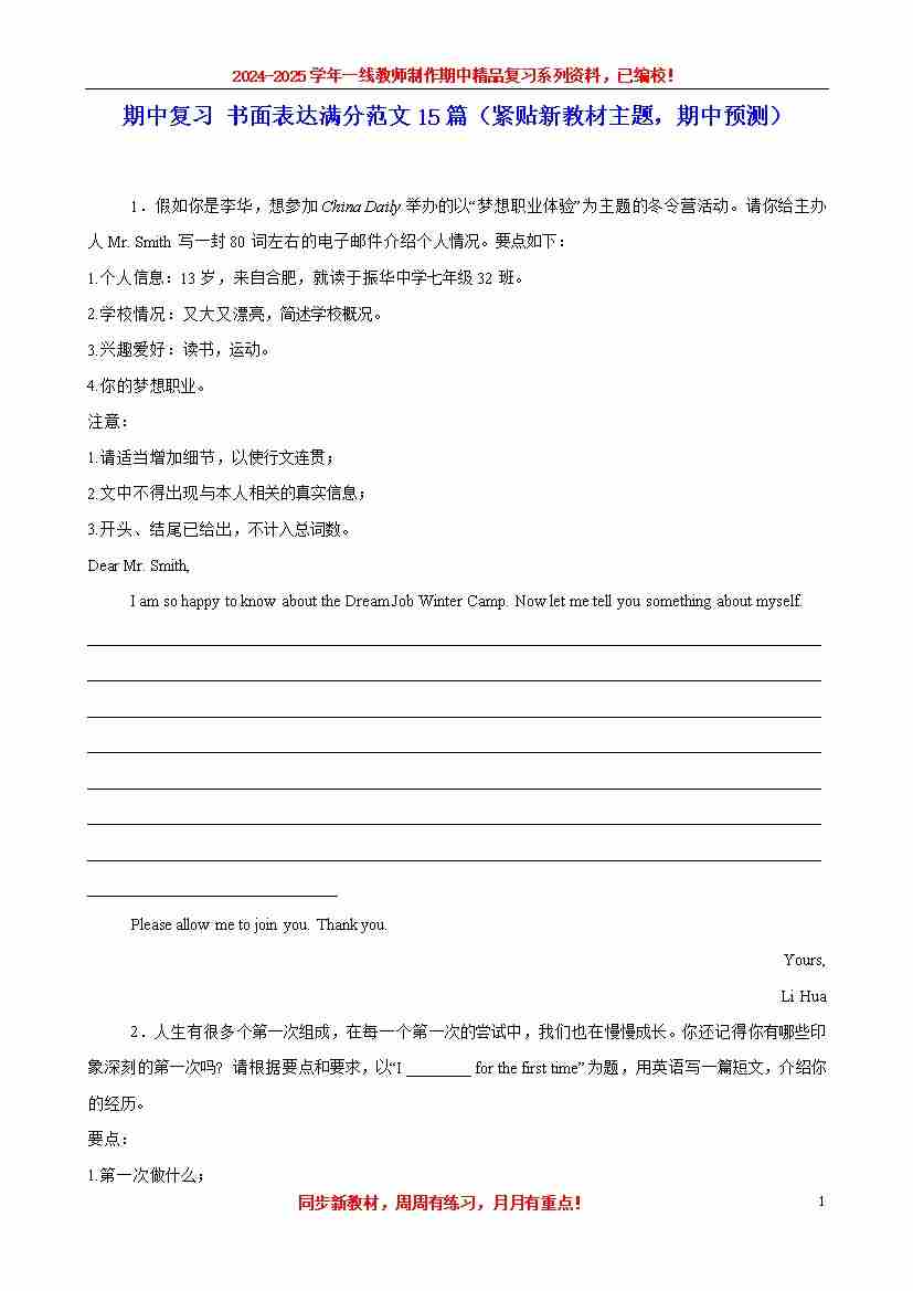 期中复习 书面表达满分范文15篇(紧贴新教材主题,期中预测)(原卷版)