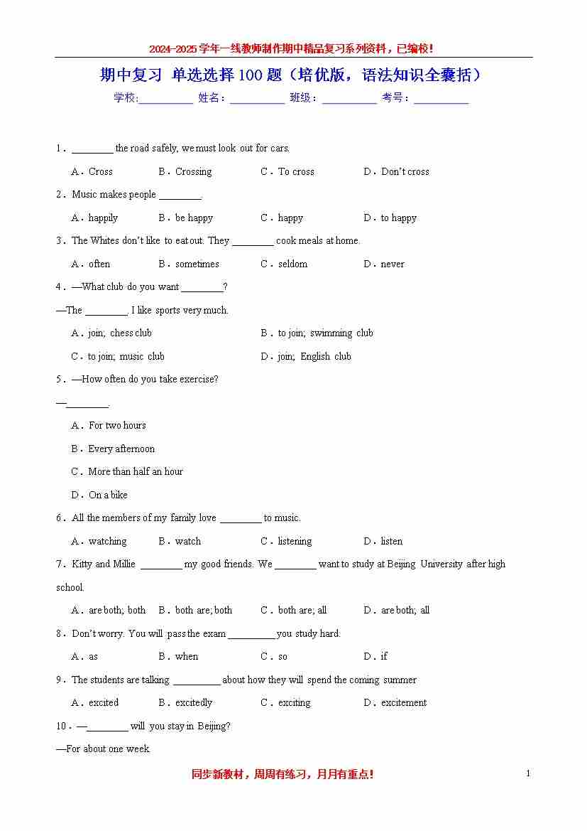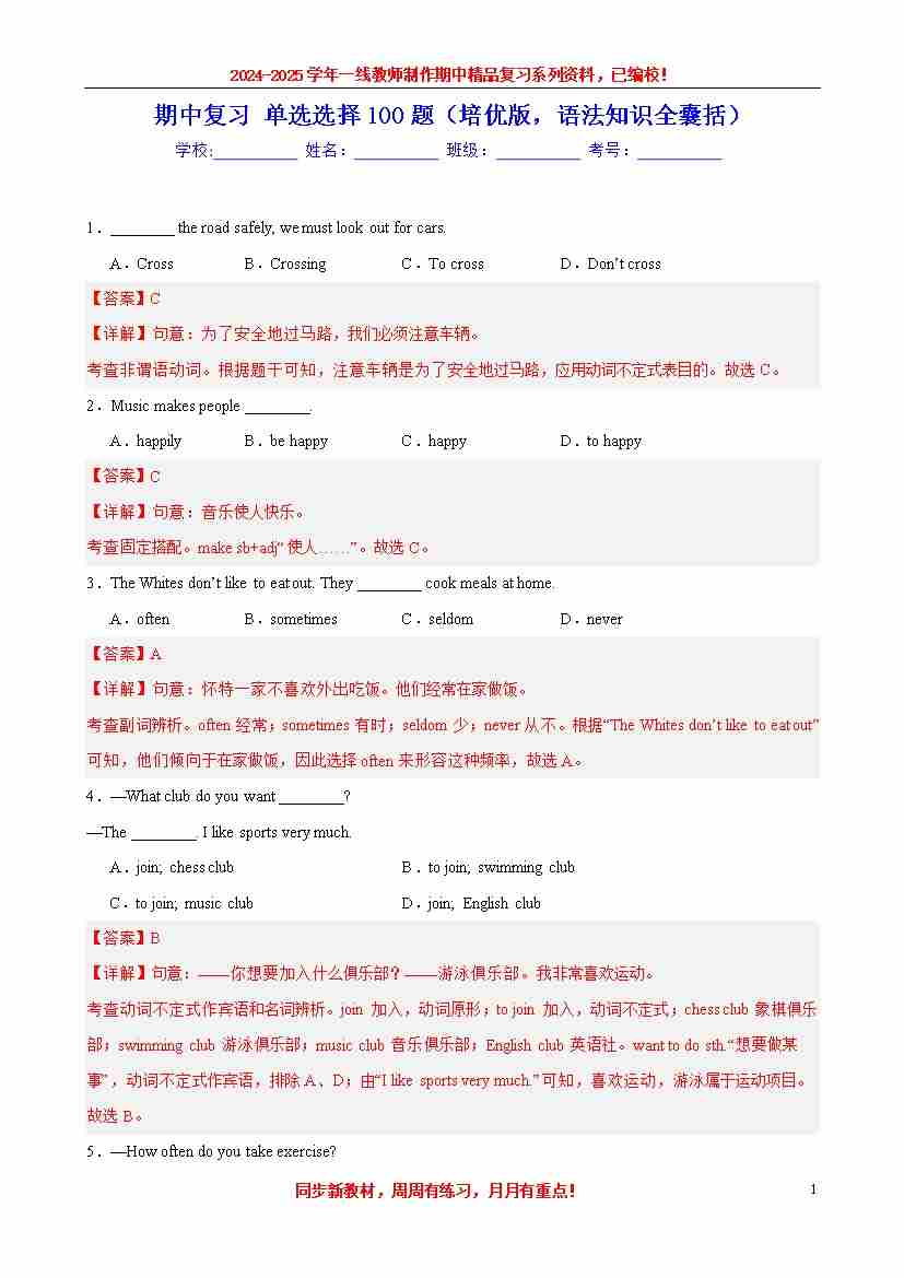 期中复习 单选选择100题(培优版,语法知识全囊括)(原卷版)