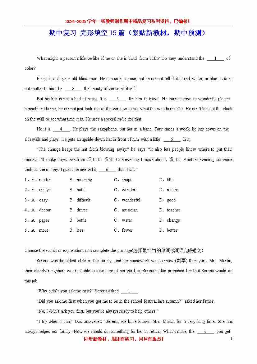 期中复习 完形填空15篇(紧贴新教材,期中预测)(原卷版)