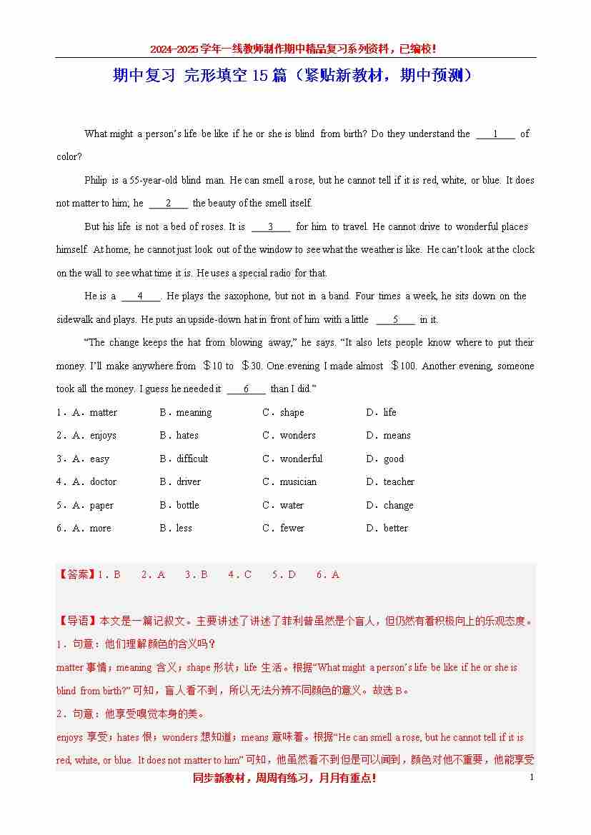 期中复习 完形填空15篇(紧贴新教材,期中预测)(解析版)