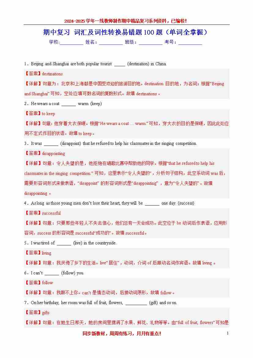 期中复习 词汇及词性转换易错题100题(单词全掌握)(解析版)