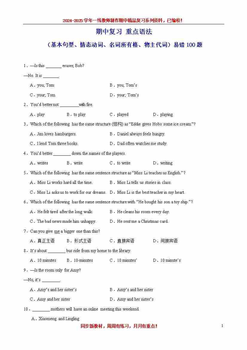 期中复习 重点语法(基本句型、情态动词、名词所有格、物主代词)易错题100题(原卷版)