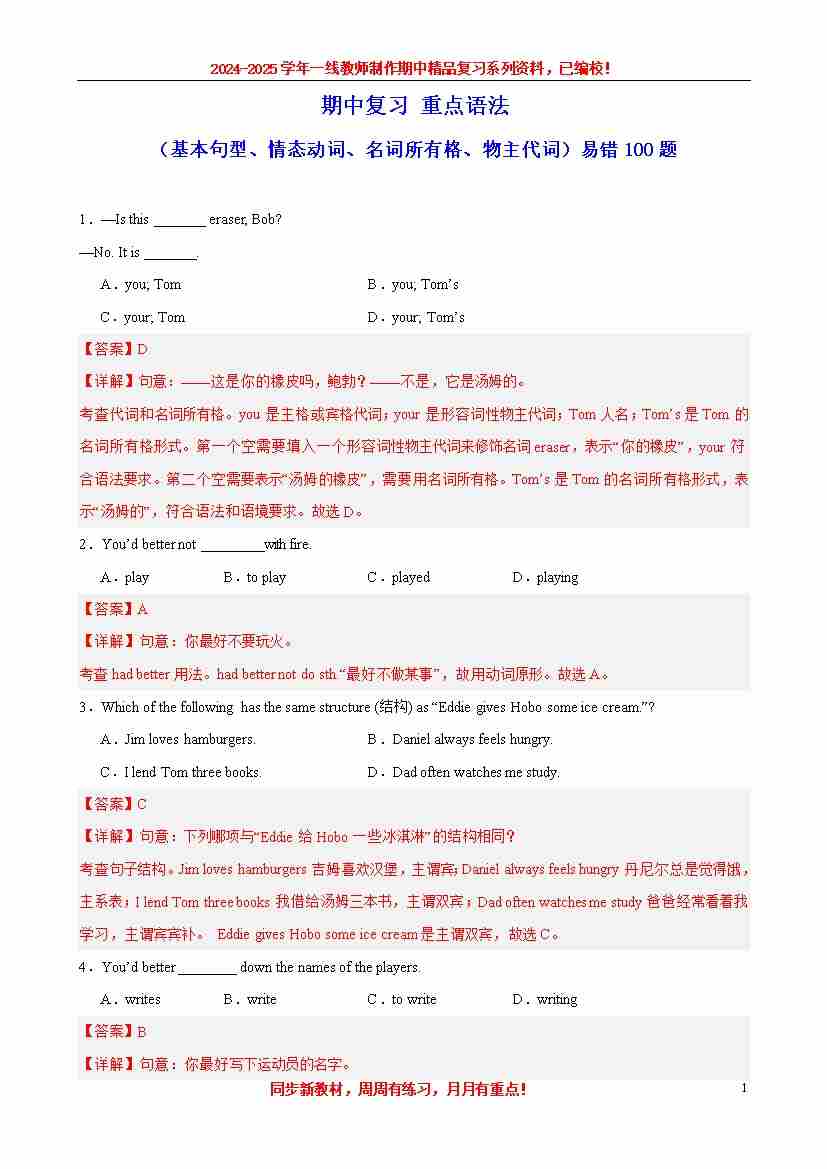 期中复习 重点语法(基本句型、情态动词、名词所有格、物主代词)易错题100题(解析版)