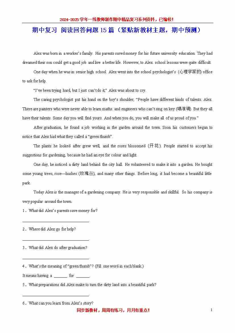 期中复习 阅读回答问题15篇(紧贴新教材主题,期中预测)(原卷版)