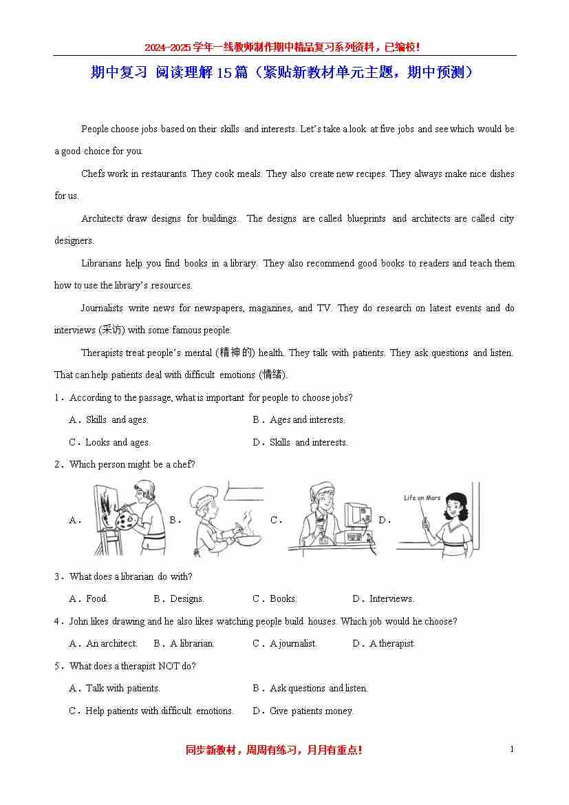 期中复习 阅读理解15篇(紧贴新教材单元主题,期中预测)(原卷版)