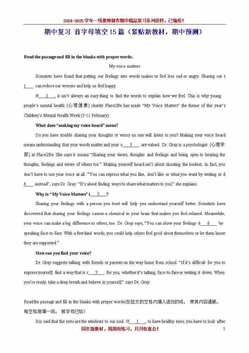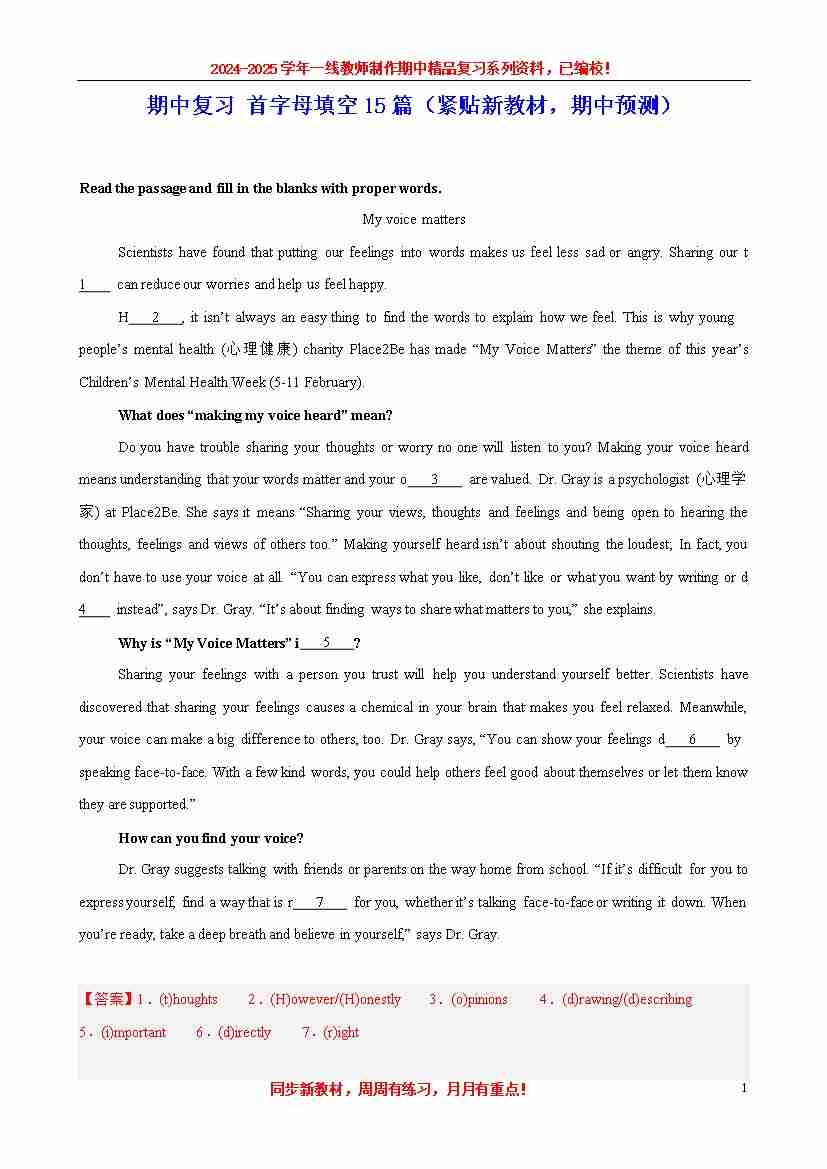 期中复习 首字母填空15篇(紧贴新教材,期中预测)(解析版)