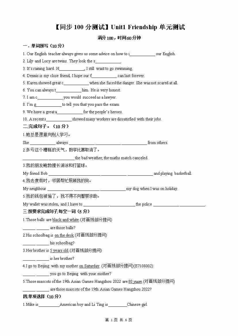 【同步100分测试】Unit1 Friendship单元测试(原卷版)