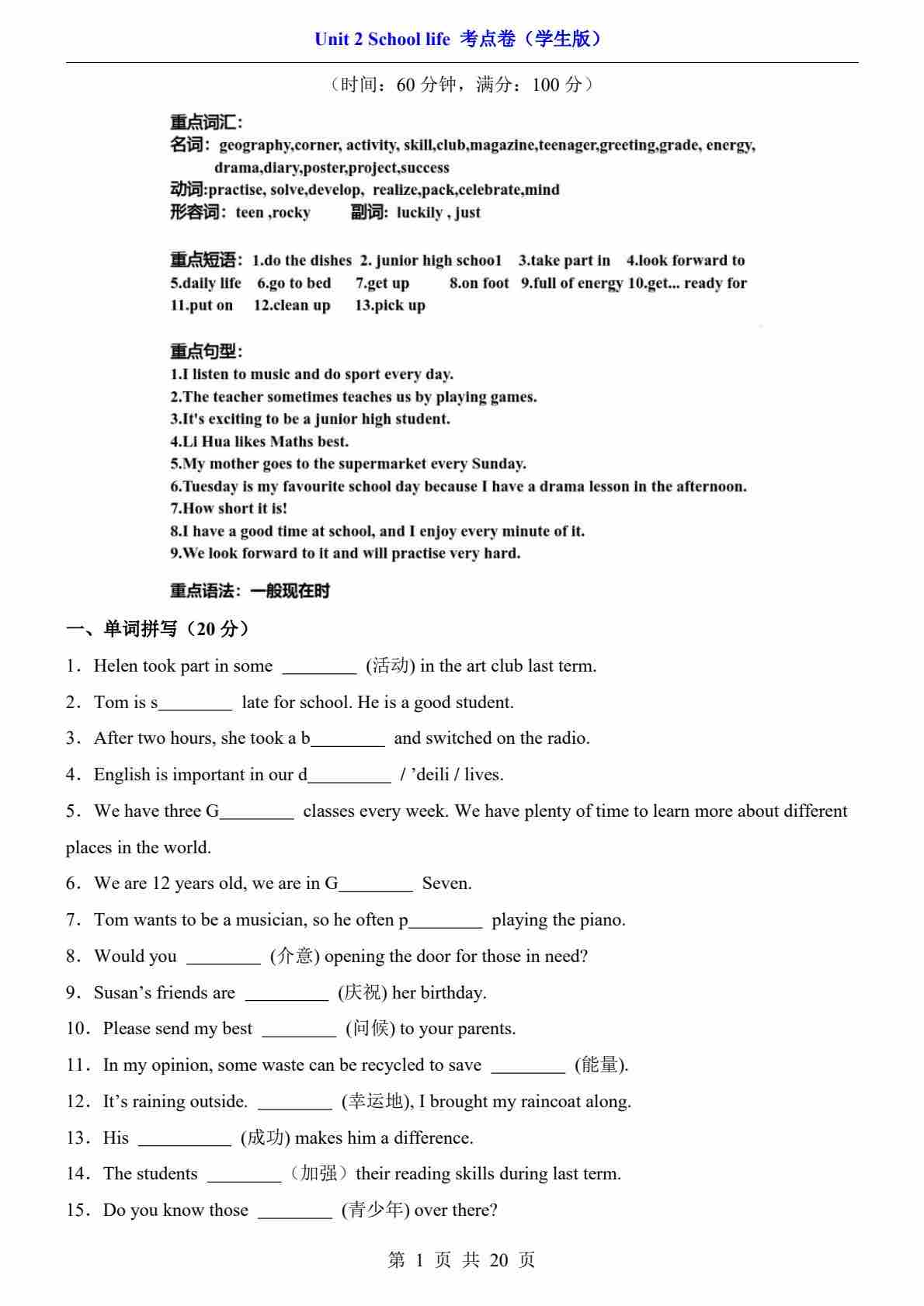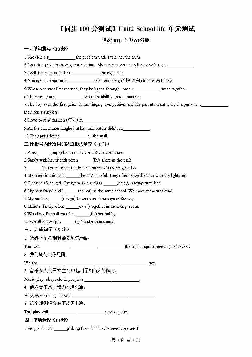 【同步100分测试】Unit2 School life单元测试(原卷版)