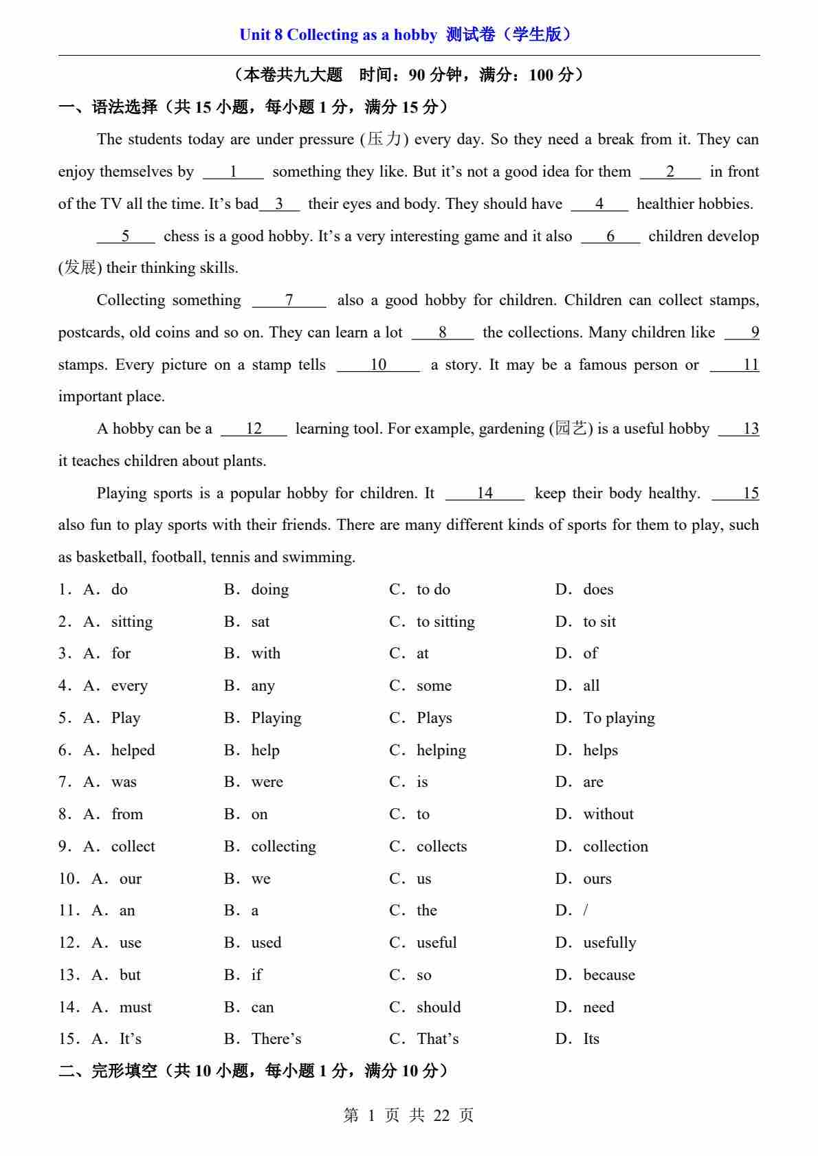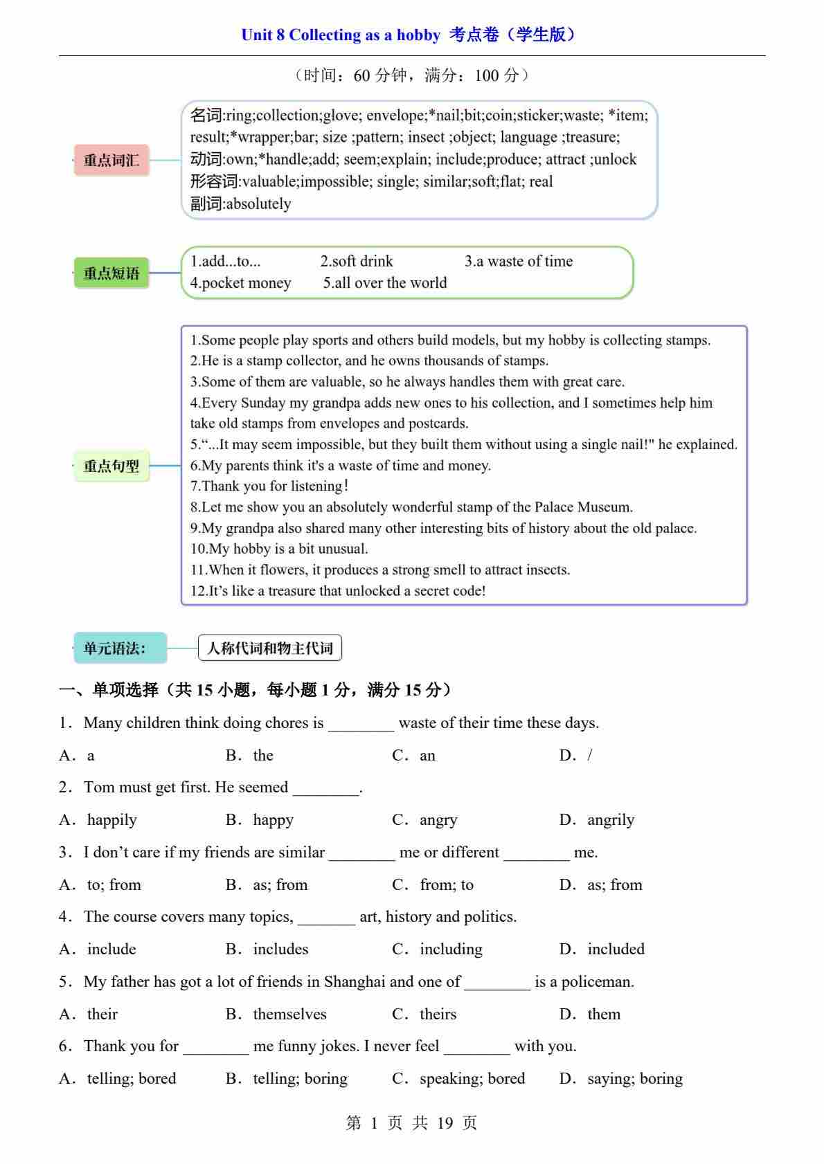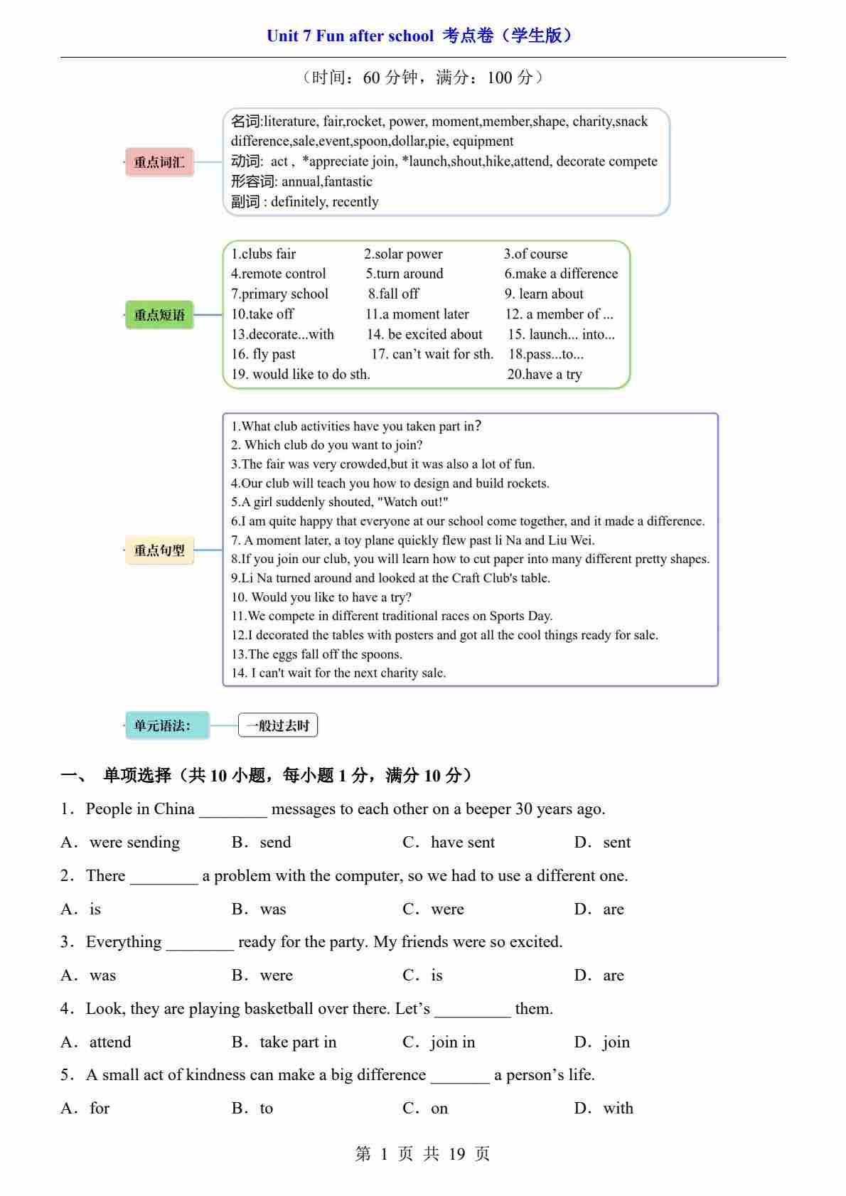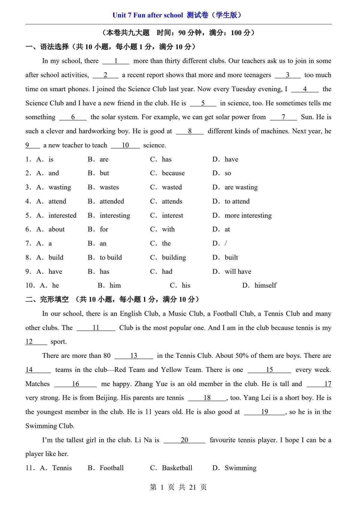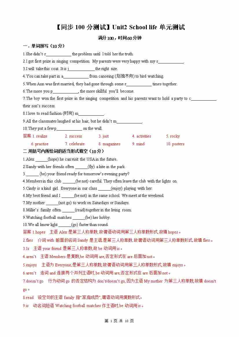 【同步100分测试】Unit2 School life单元测试(解析版)