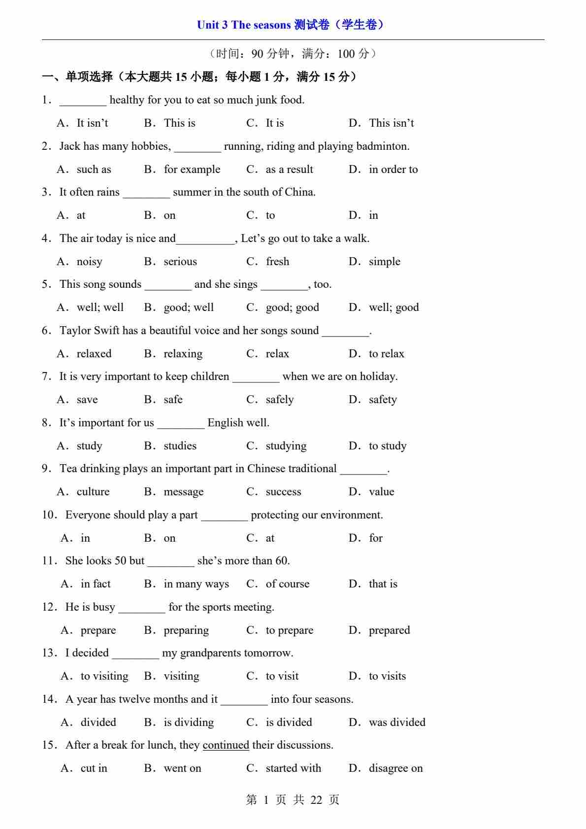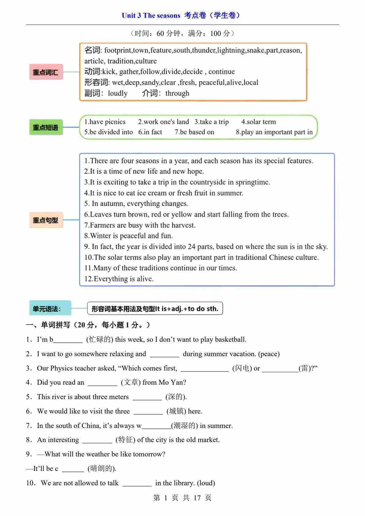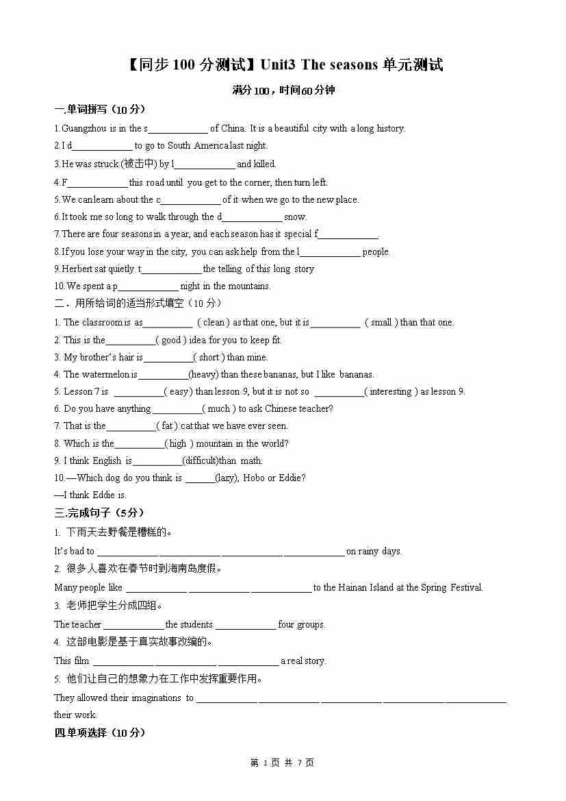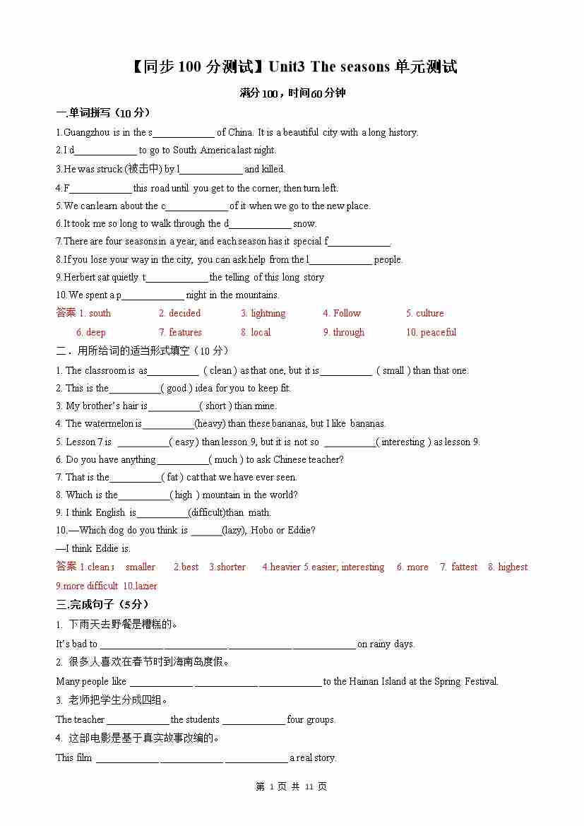 【同步100分测试】Unit3 The seasons单元测试(解析版)