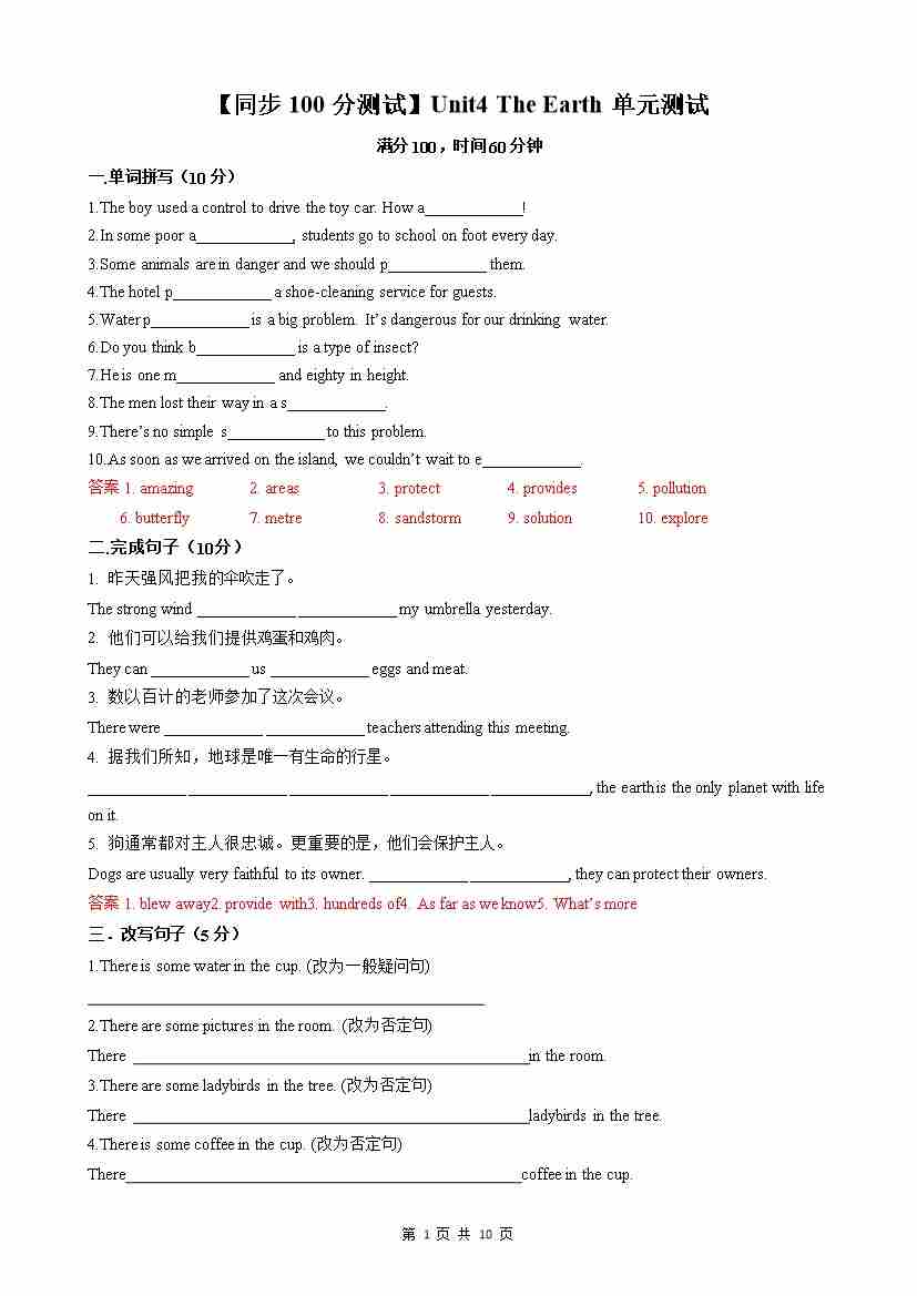 【同步100分测试】Unit4 The Earth单元测试(解析版)