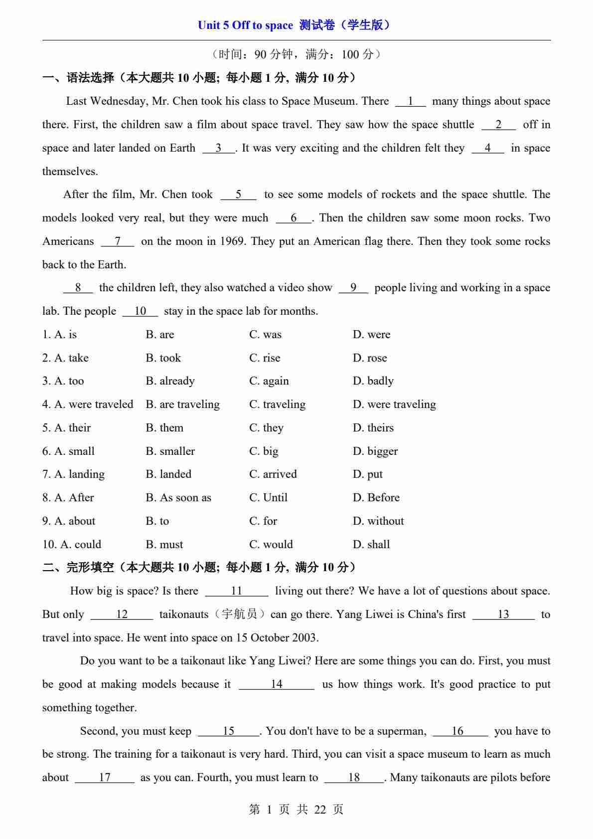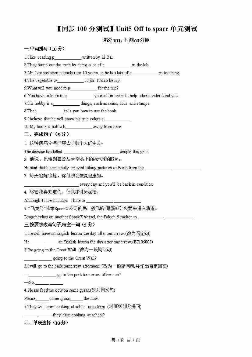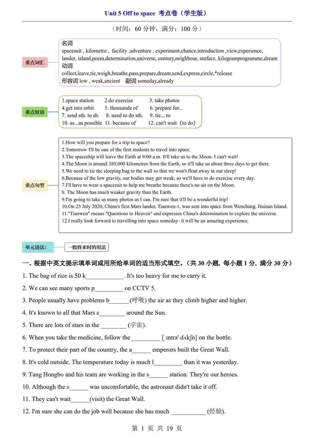 【同步100分测试】Unit5 Off to space单元测试(原卷版)