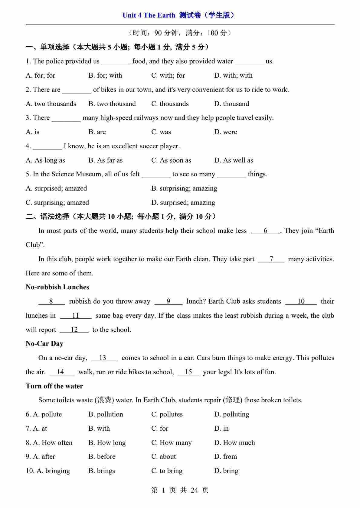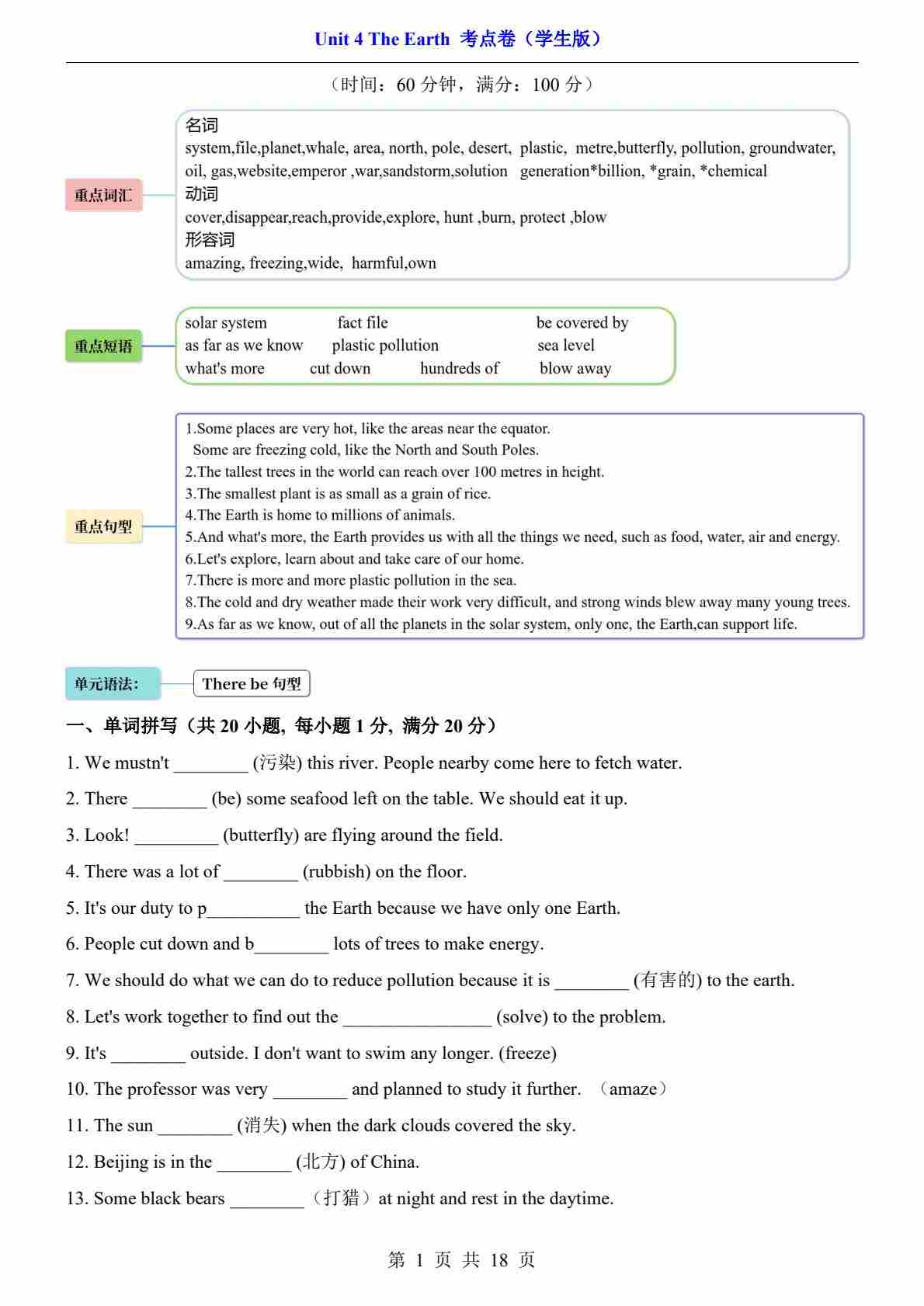 【同步100分测试】Unit4 The Earth单元测试(原卷版)