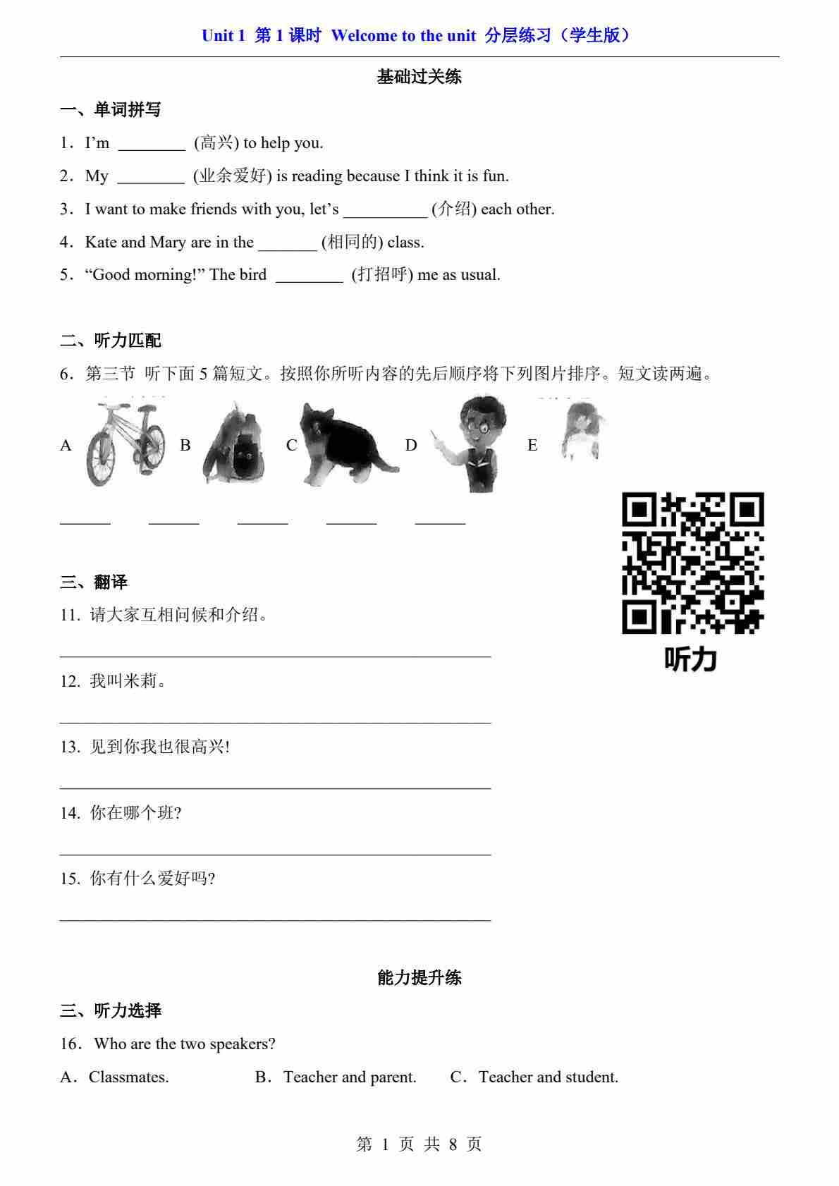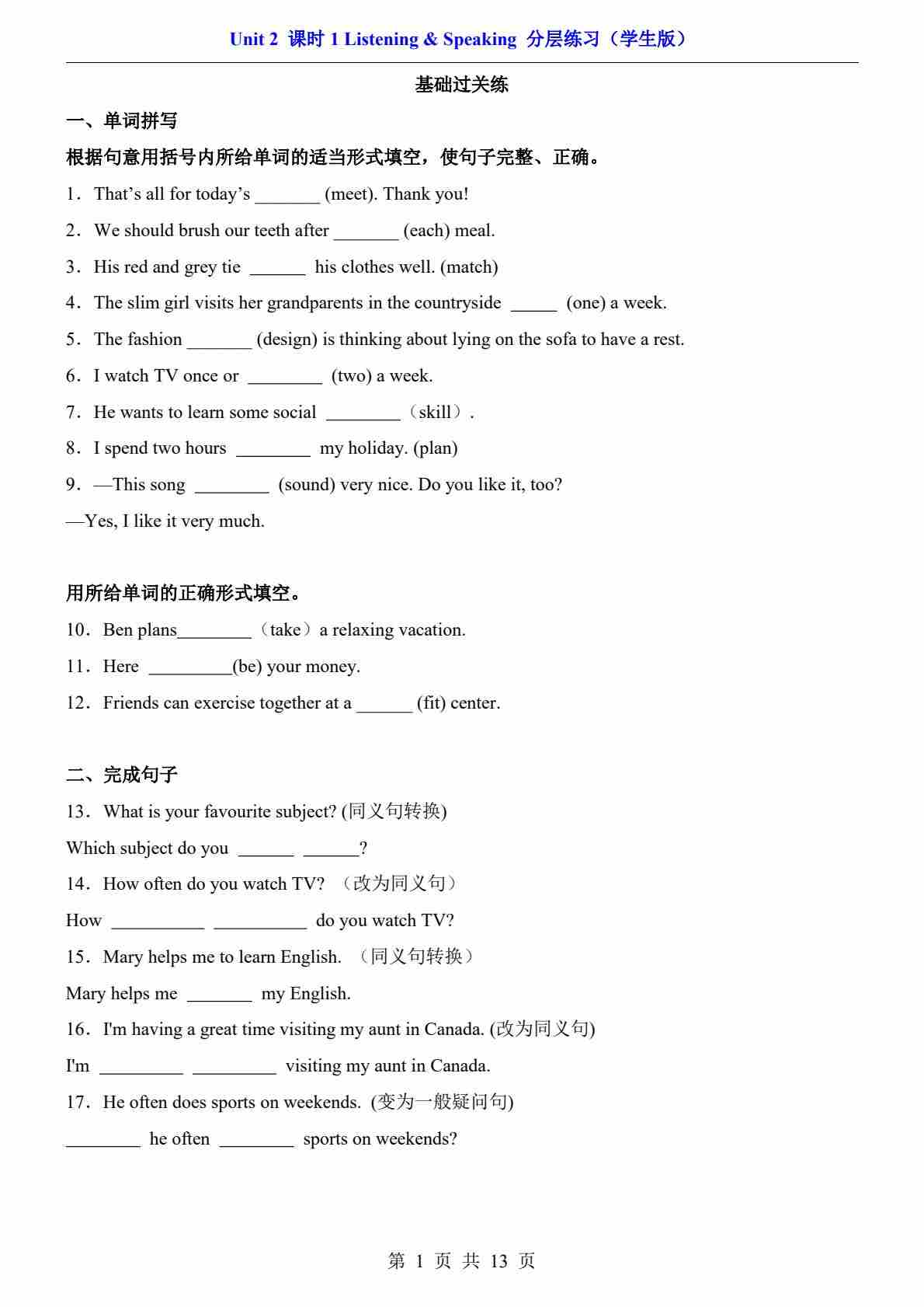 Unit 2 课时1 Listening & Speaking(分层练习)