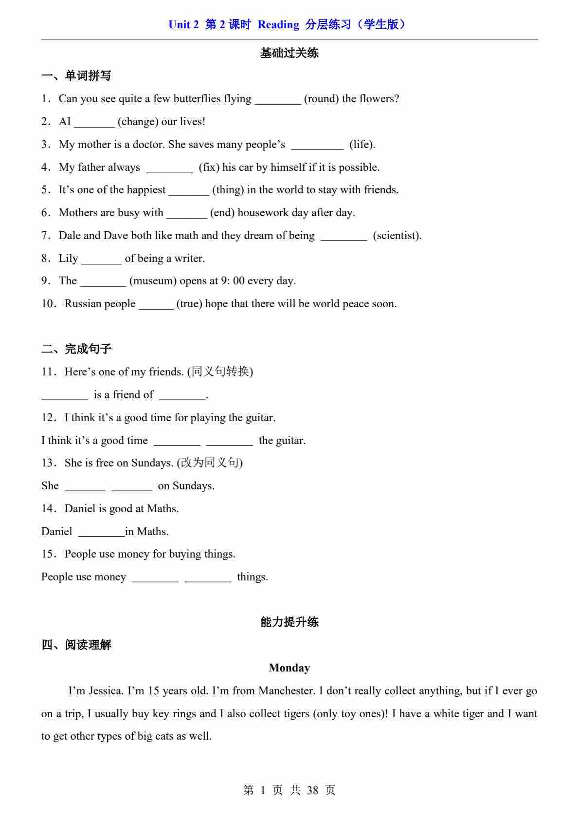 Unit 2 课时2 Reading(分层练习)