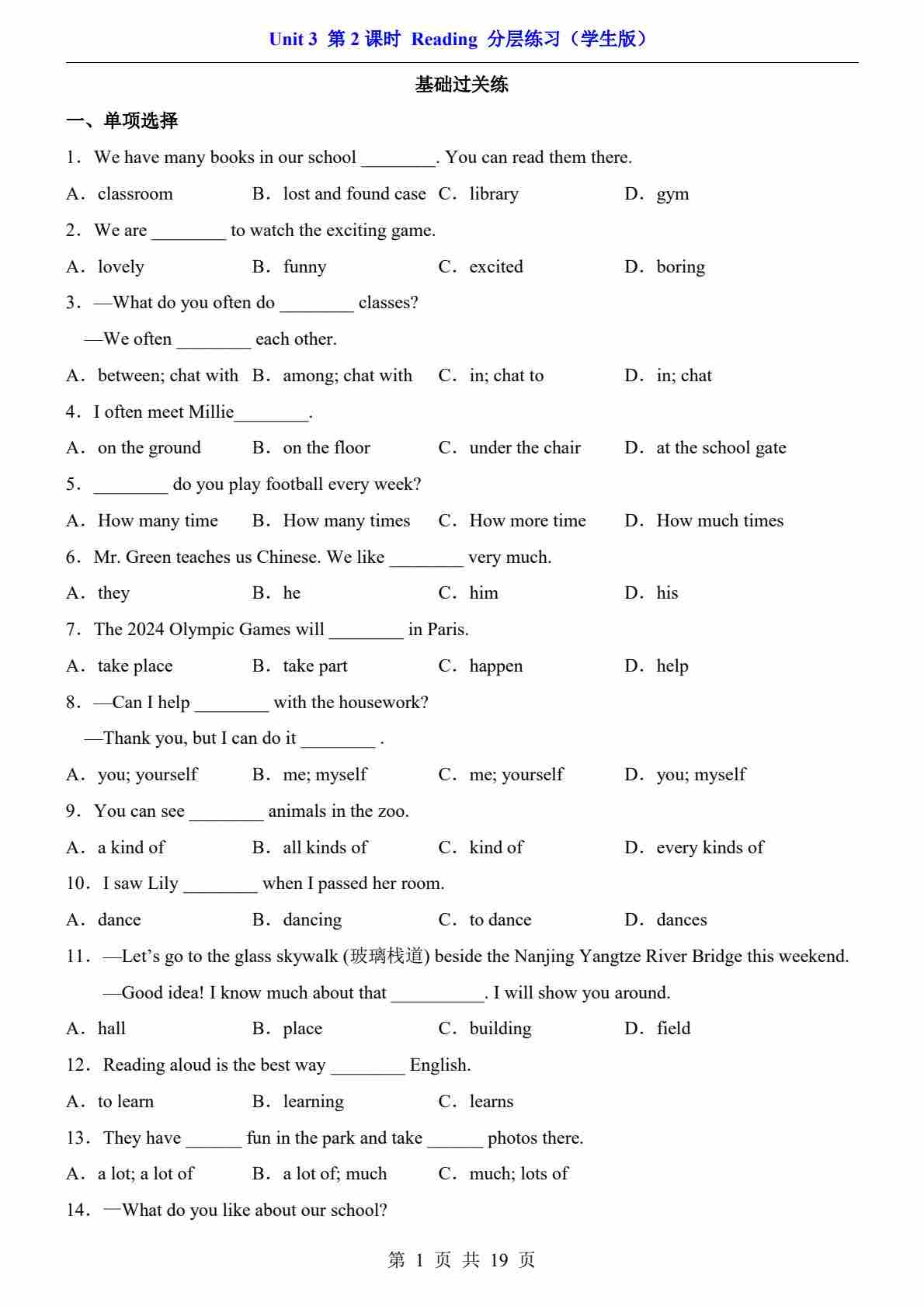 Unit 3 课时2 Reading(分层练习)