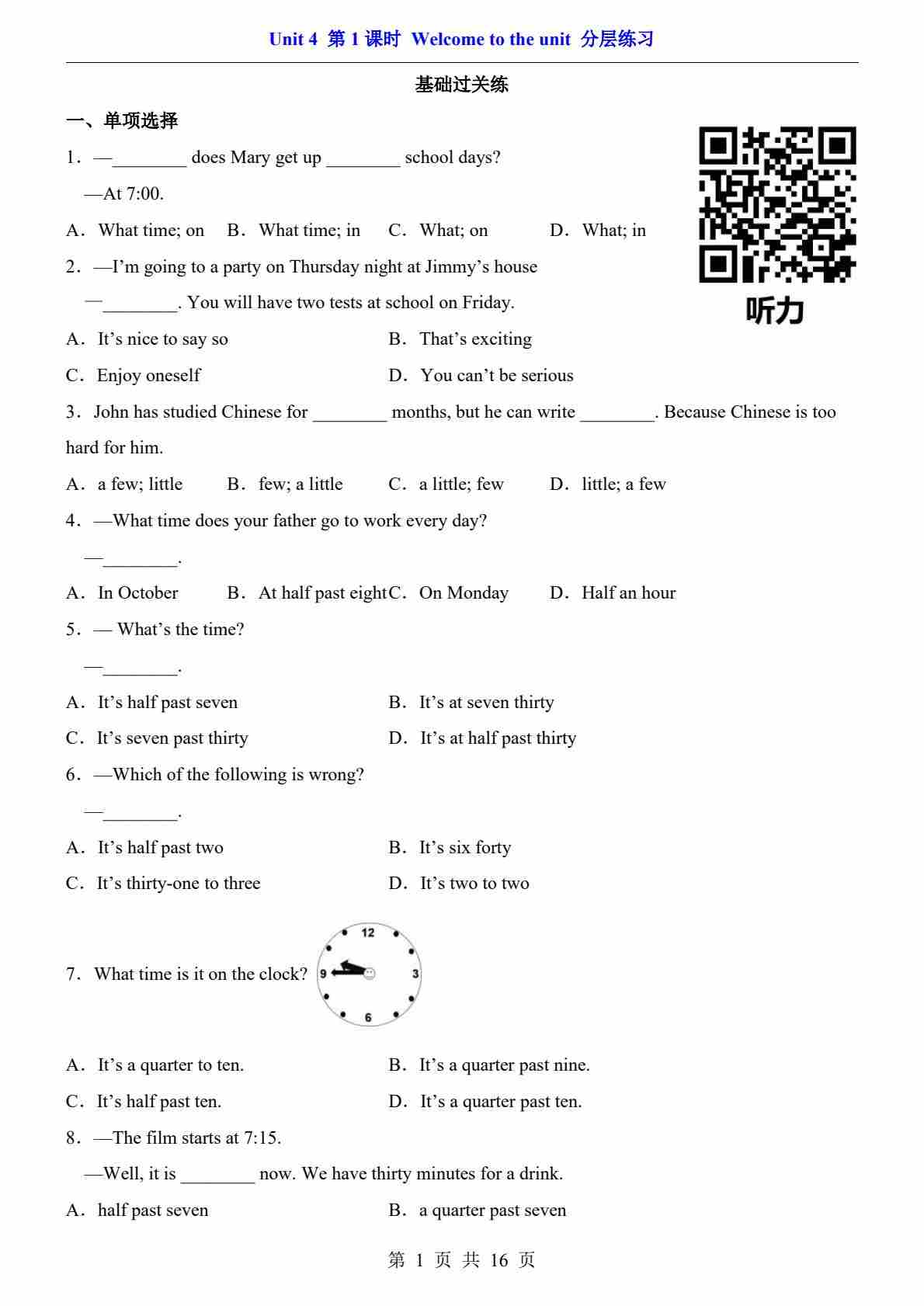 Unit 4 课时1 Welcome to the unit(分层练习)