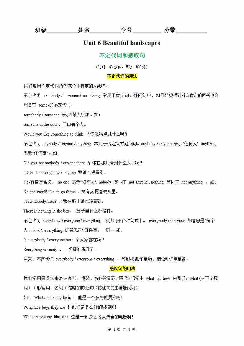 【原卷版】Unit 6 Beautiful landscapes 语法Grammar 不定代词和感叹句