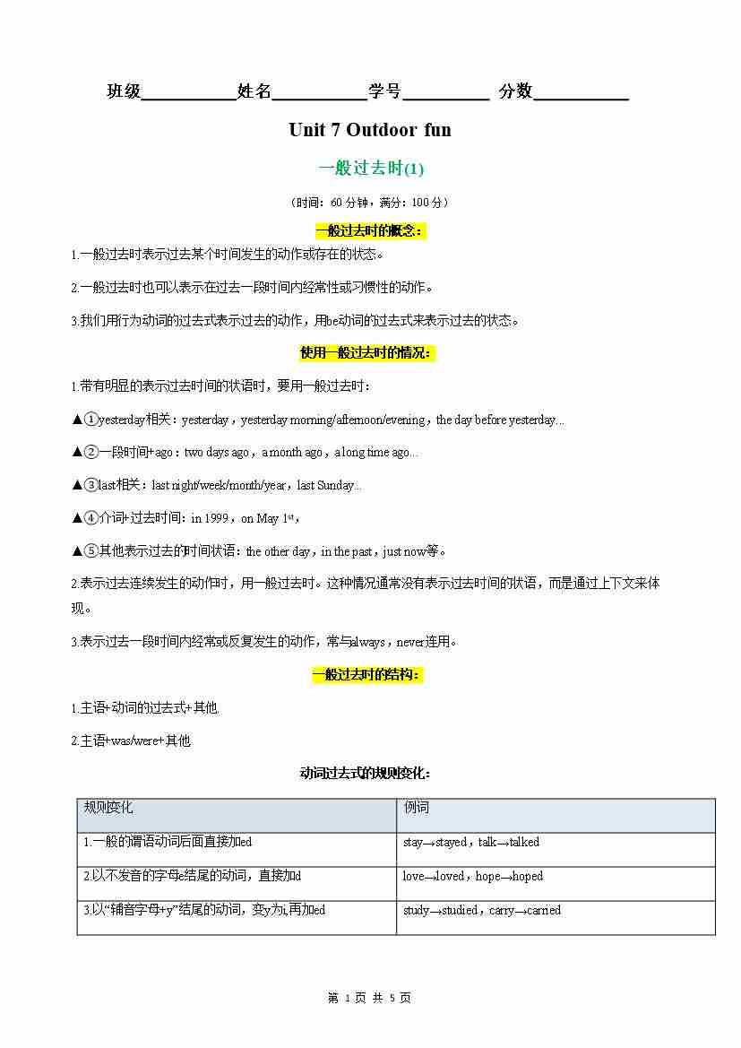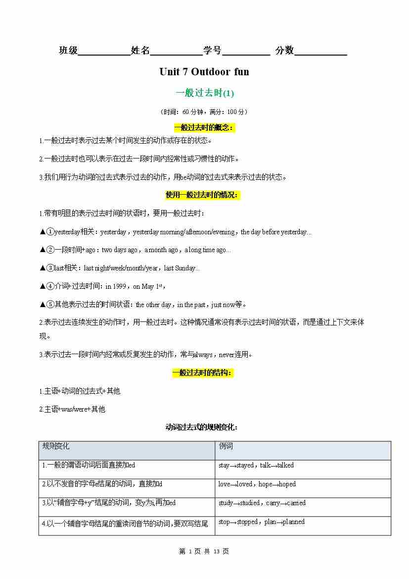 【原卷版】Unit 7 Outdoor fun 语法Grammar 一般过去时(1)