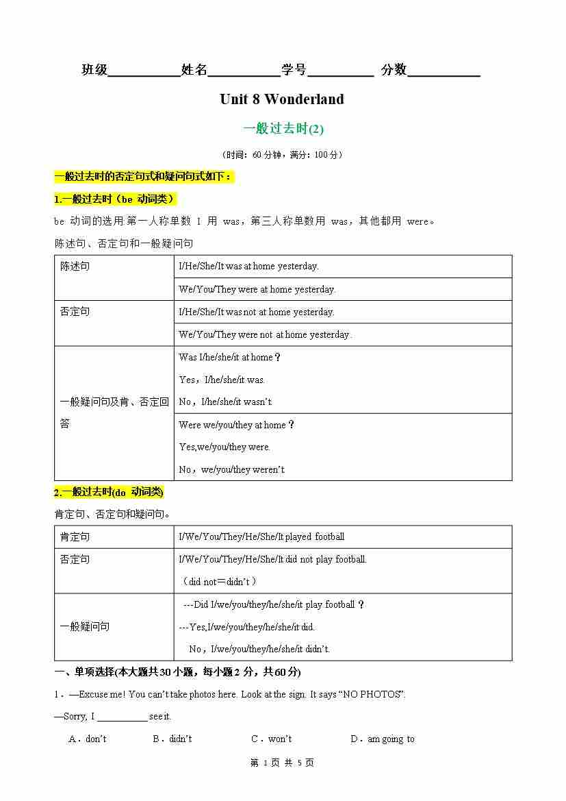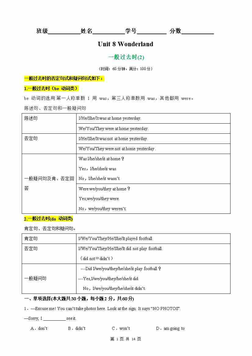 【原卷版】Unit 8 Wonderland 语法Grammar 一般过去时(2)