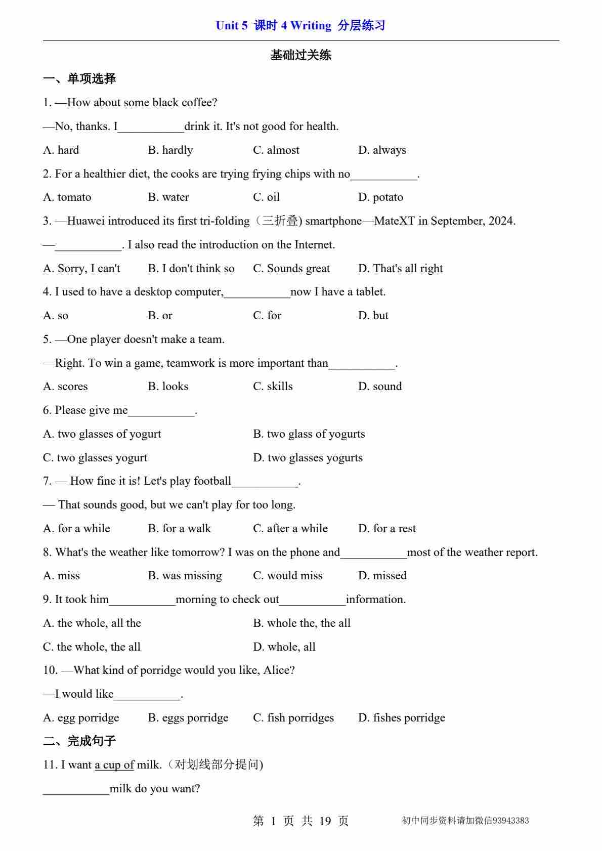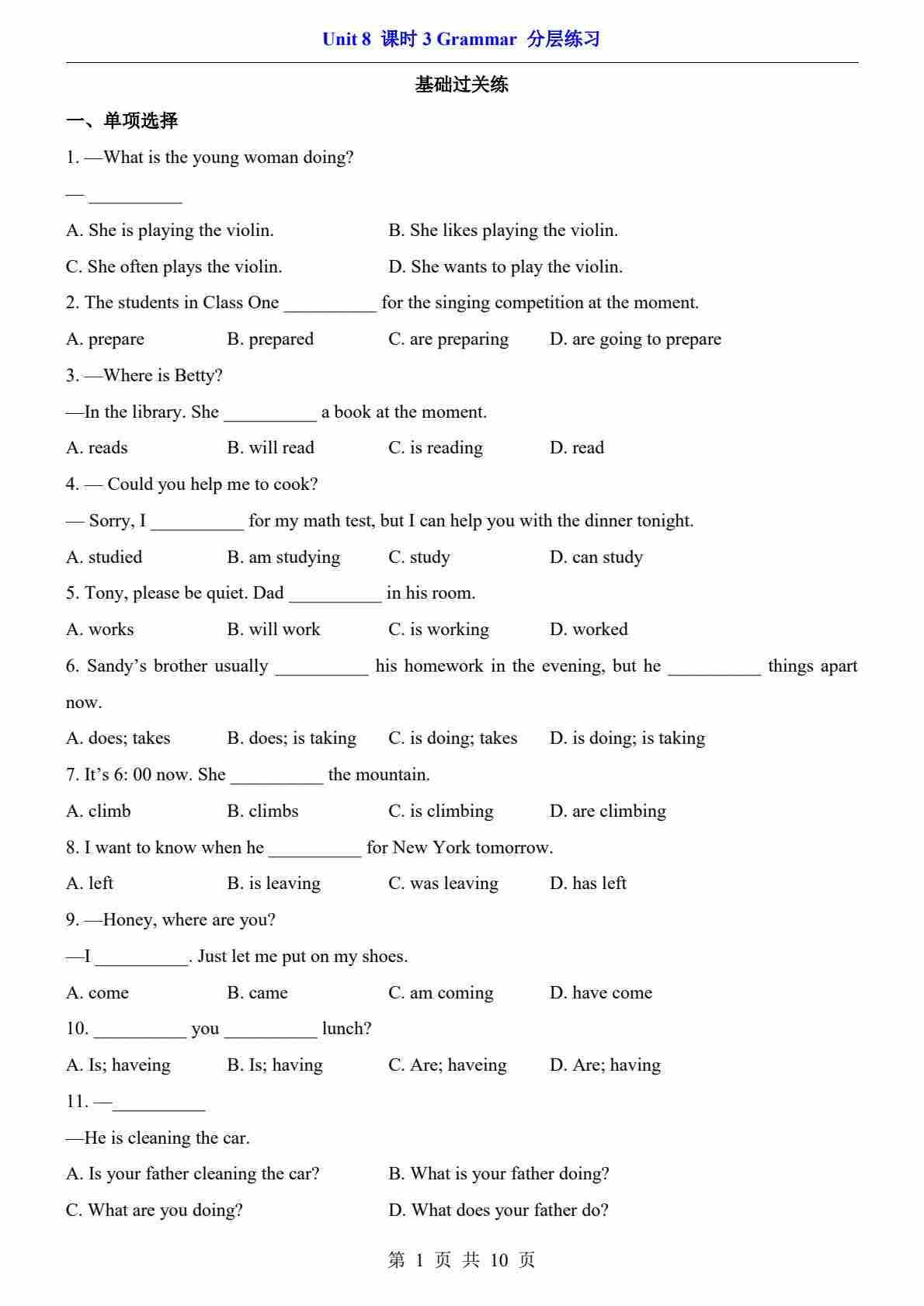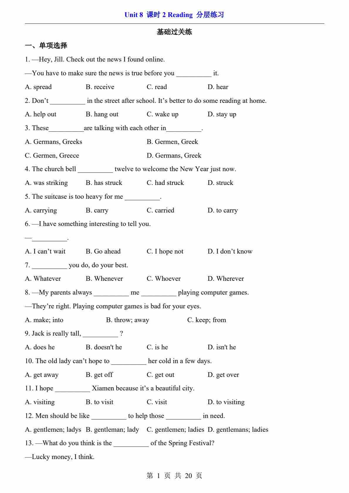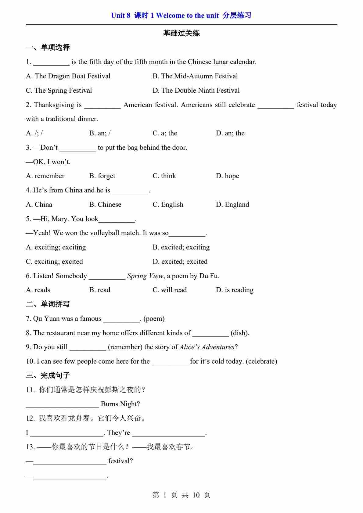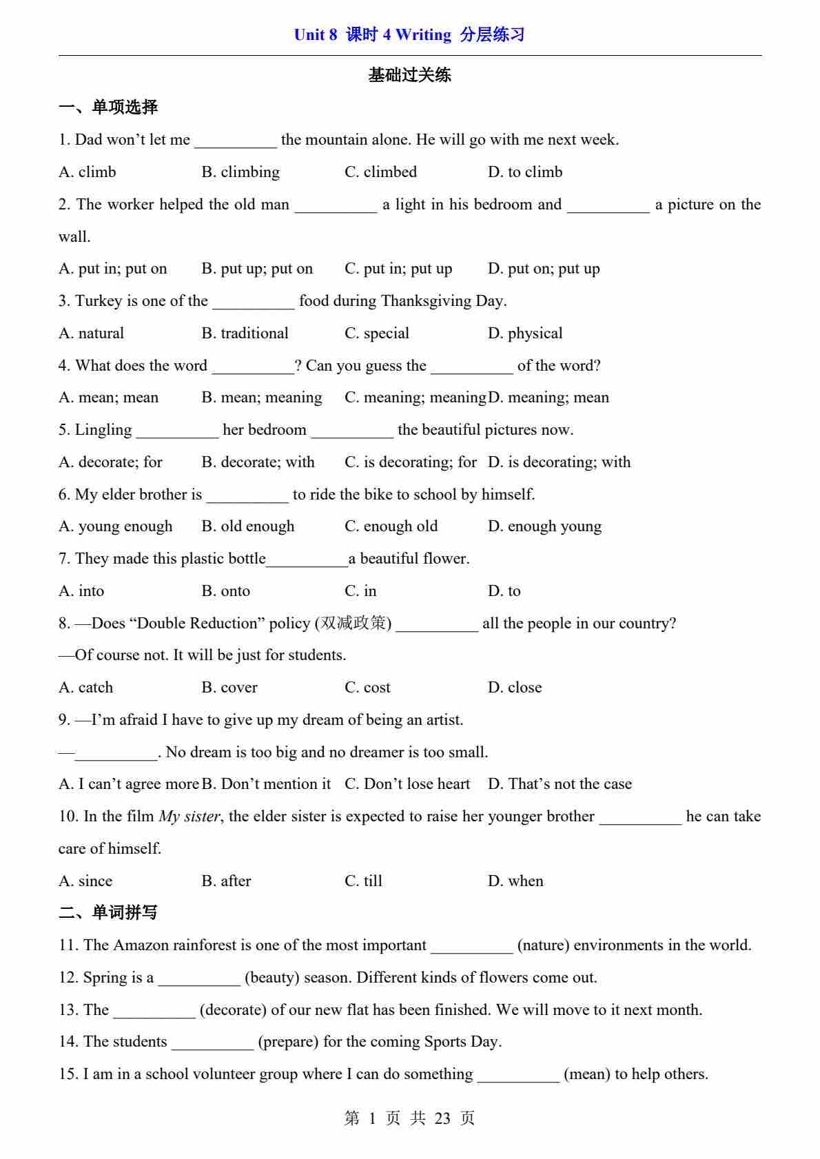 Unit 8 课时1 Welcome to the unit(分层练习)