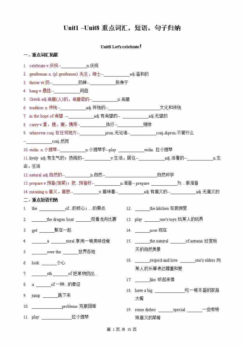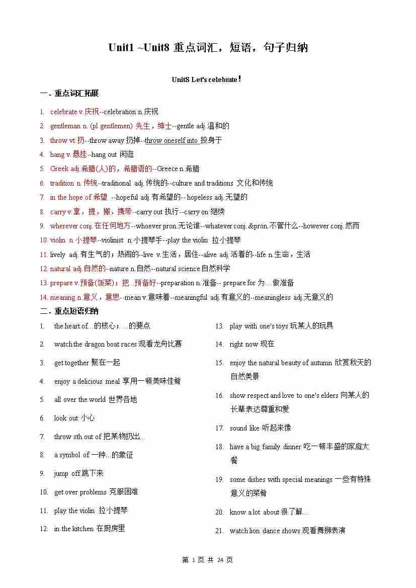 专题01 Unit1 ~Unit8重点词汇,短语,句子归纳(记忆版)
