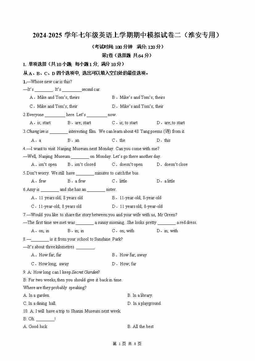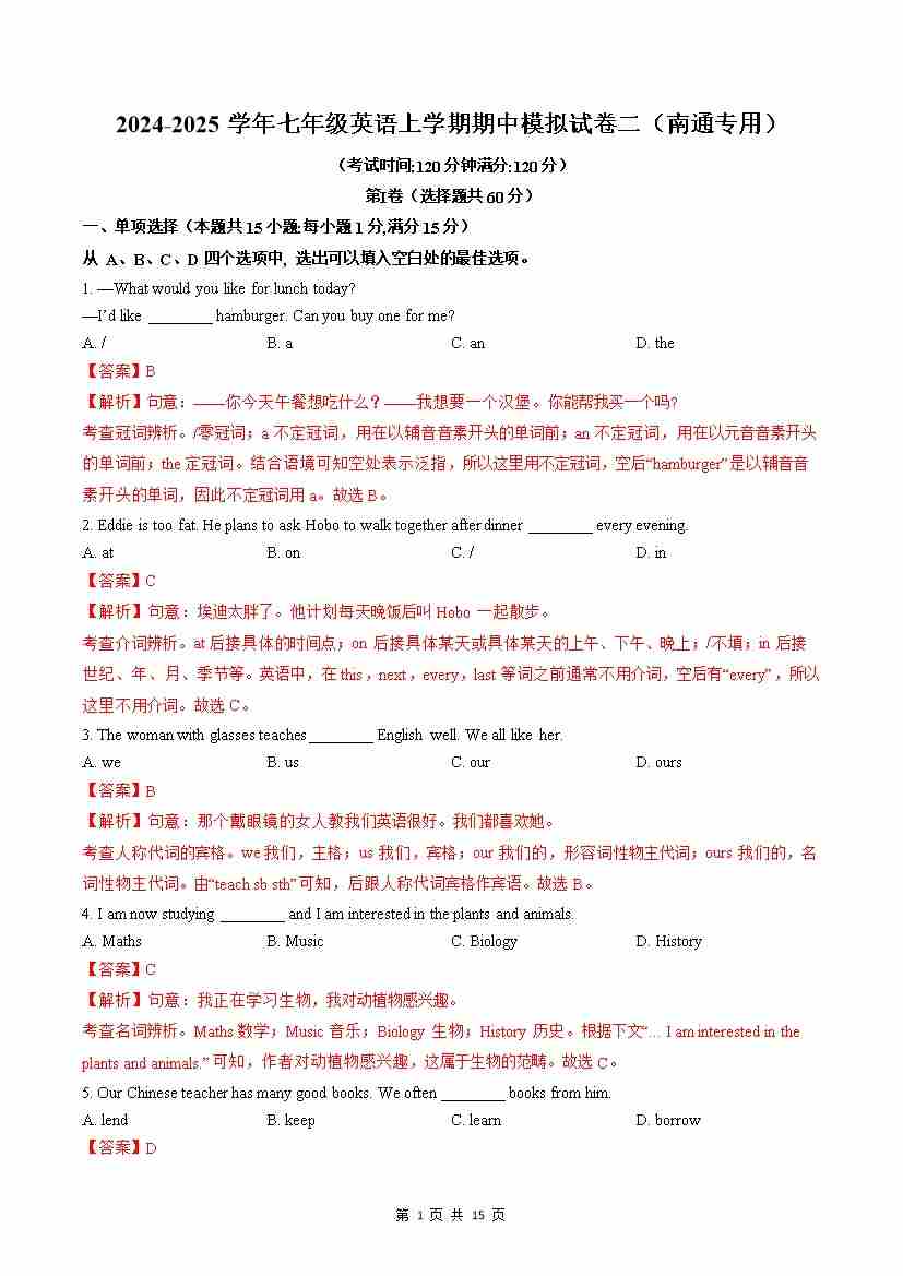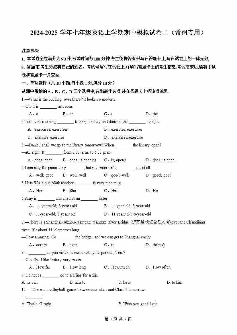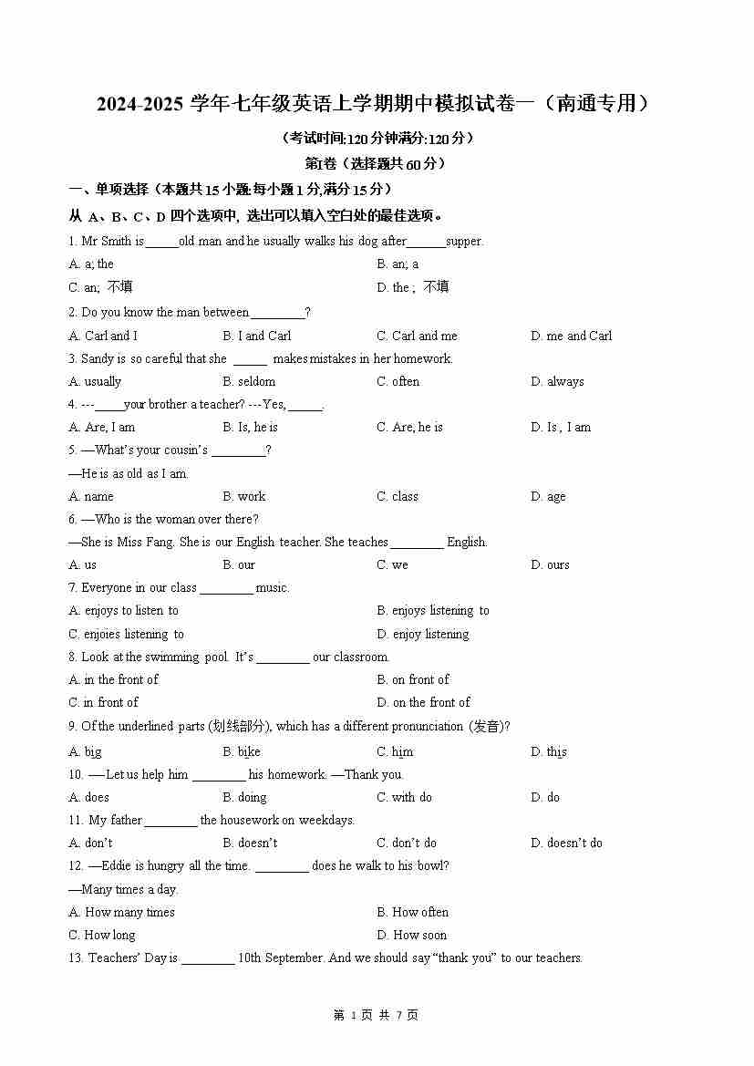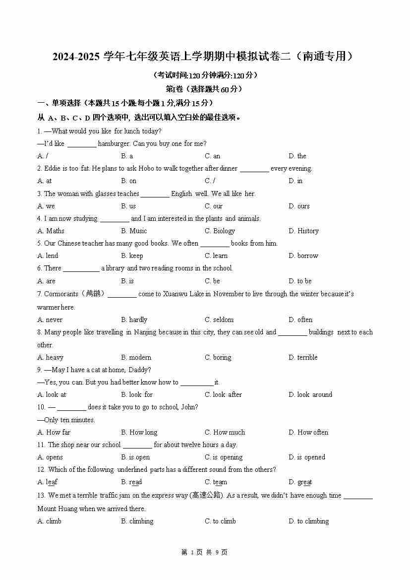 期中模拟试卷1(南通专用)(原卷版)