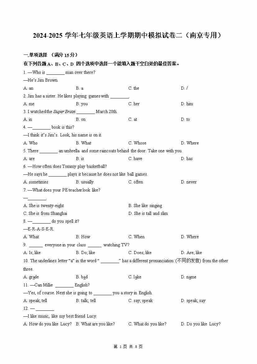 期中模拟试卷2(南通专用)(原卷版)