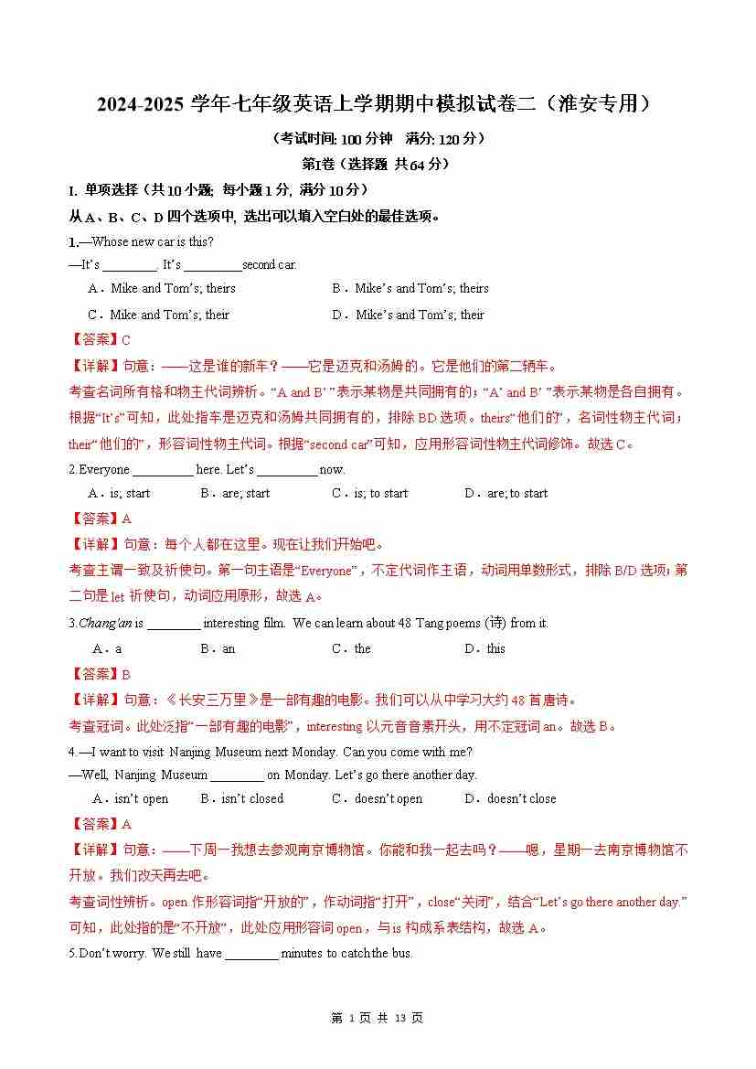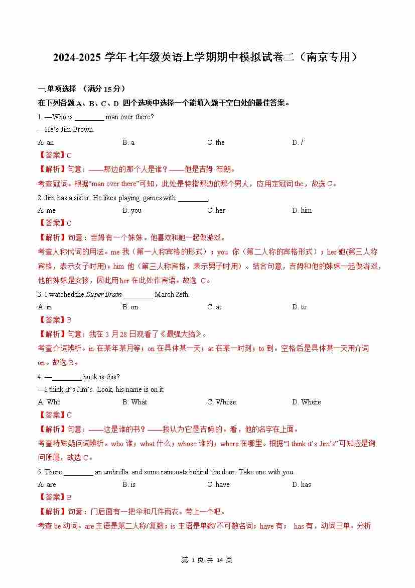 期中模拟试卷2(南京专用)(解析版)