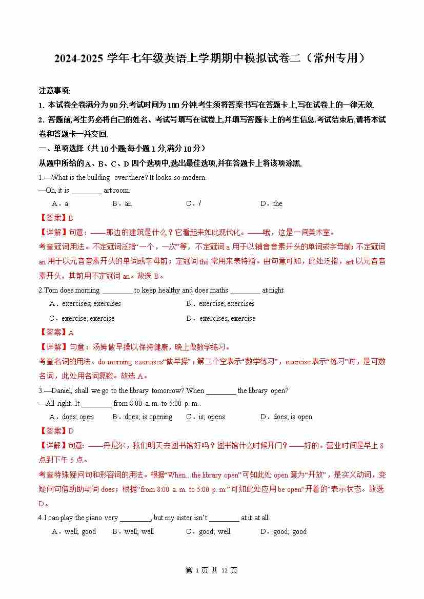 期中模拟试卷2(常州专用)(解析版)