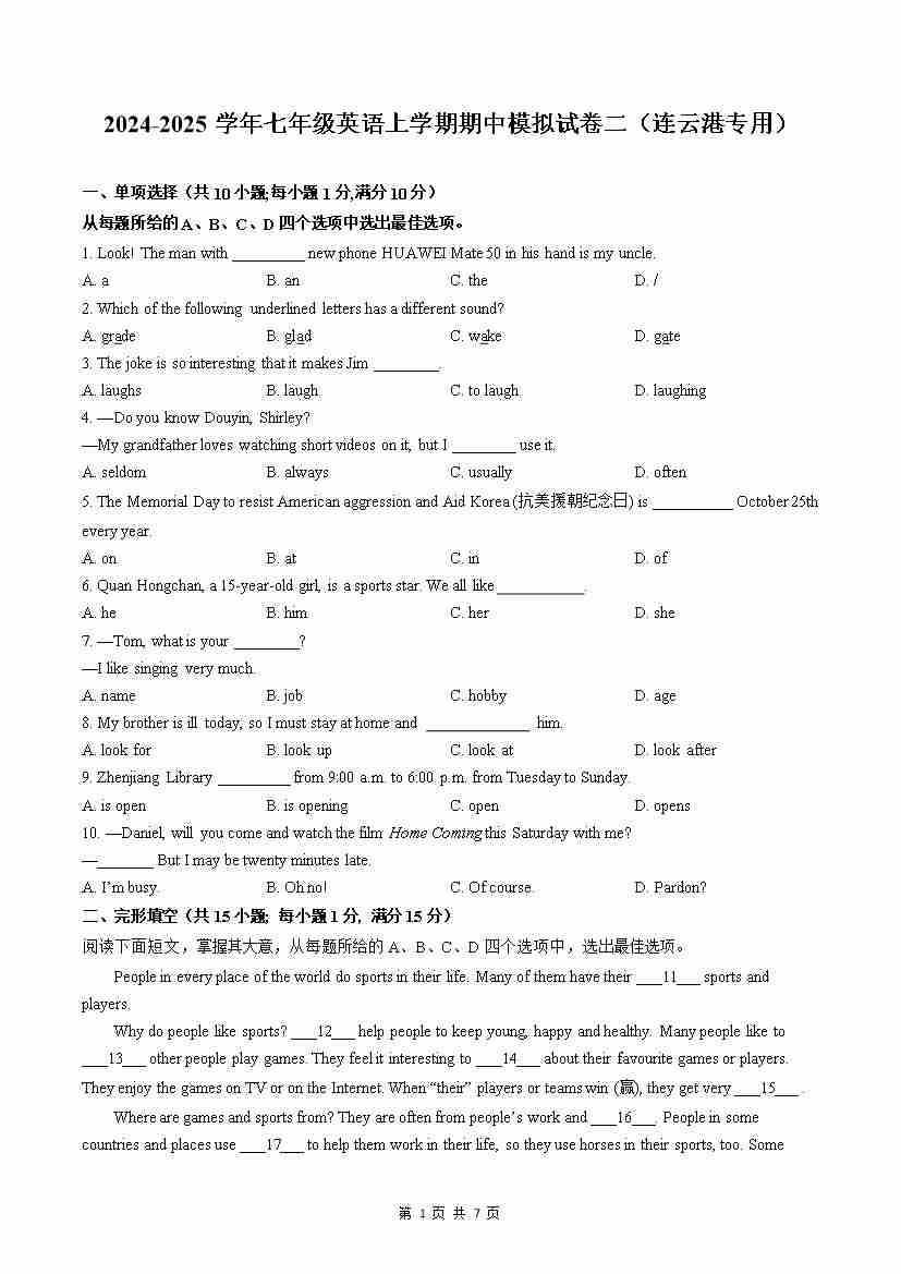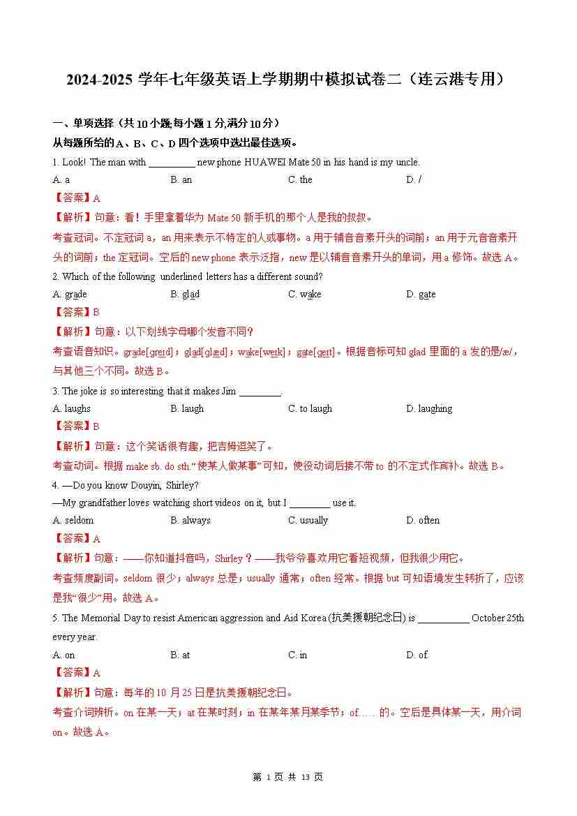 【译林版】【7年级-上】2024新版教材