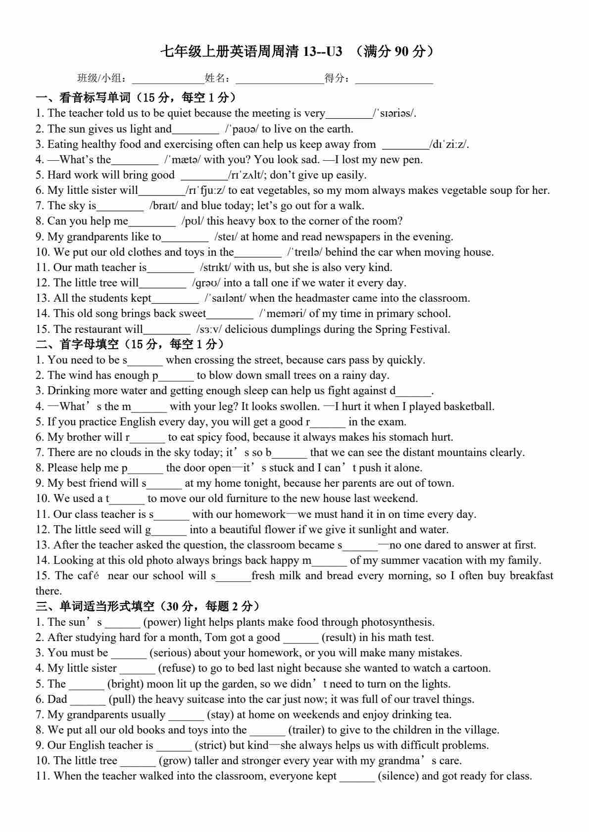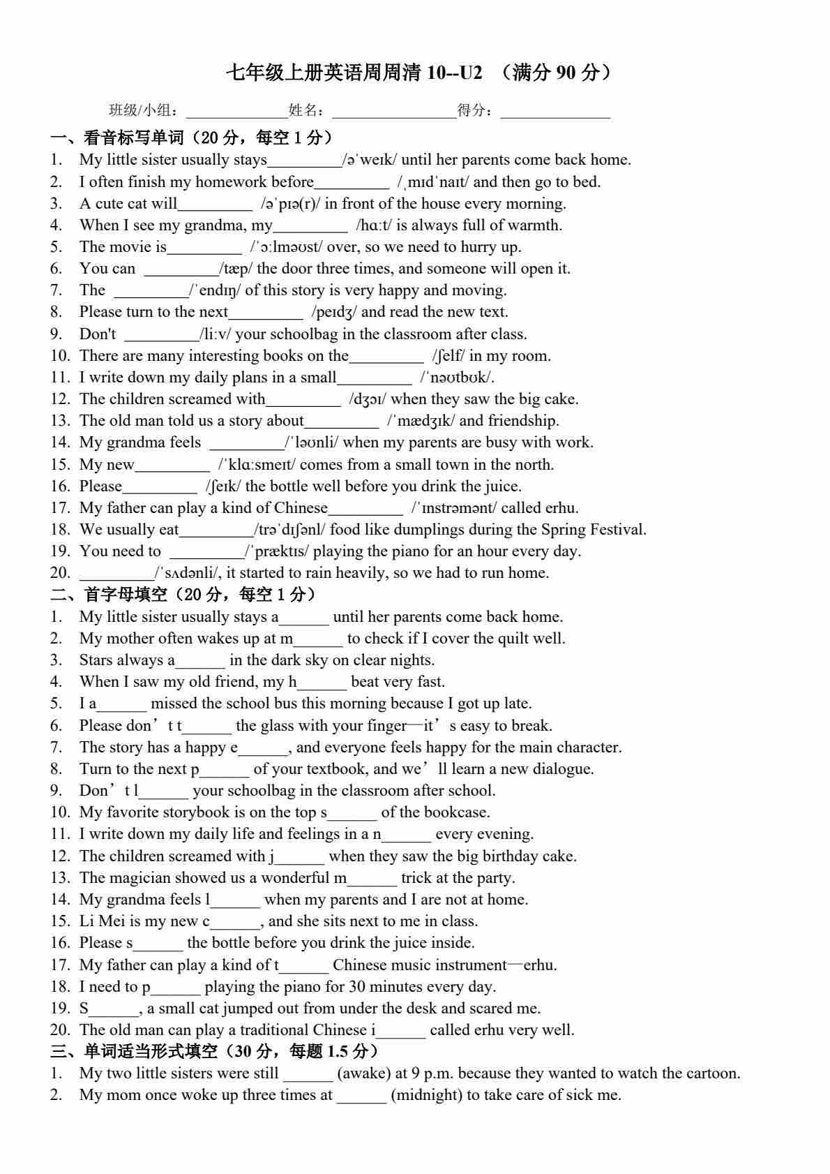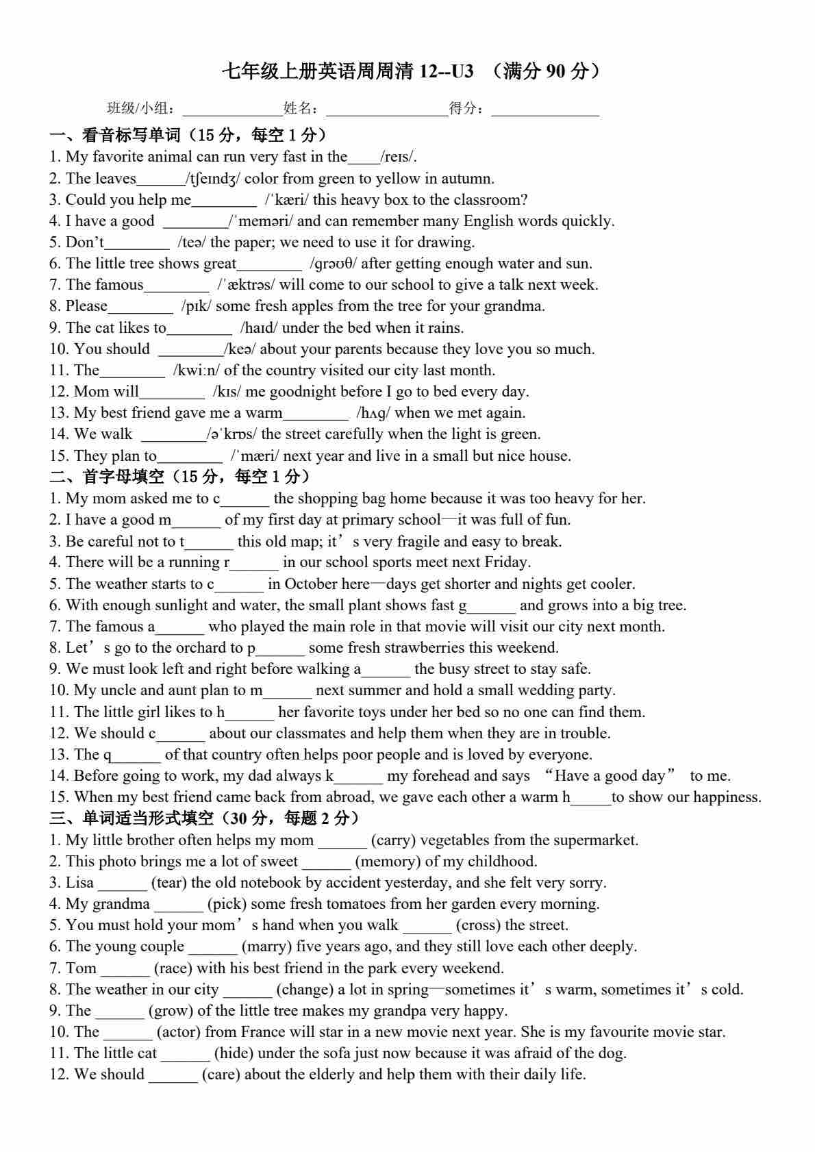 25秋外研七上英语练习题一一周周清12-Unit 3 Family ties(含答案)