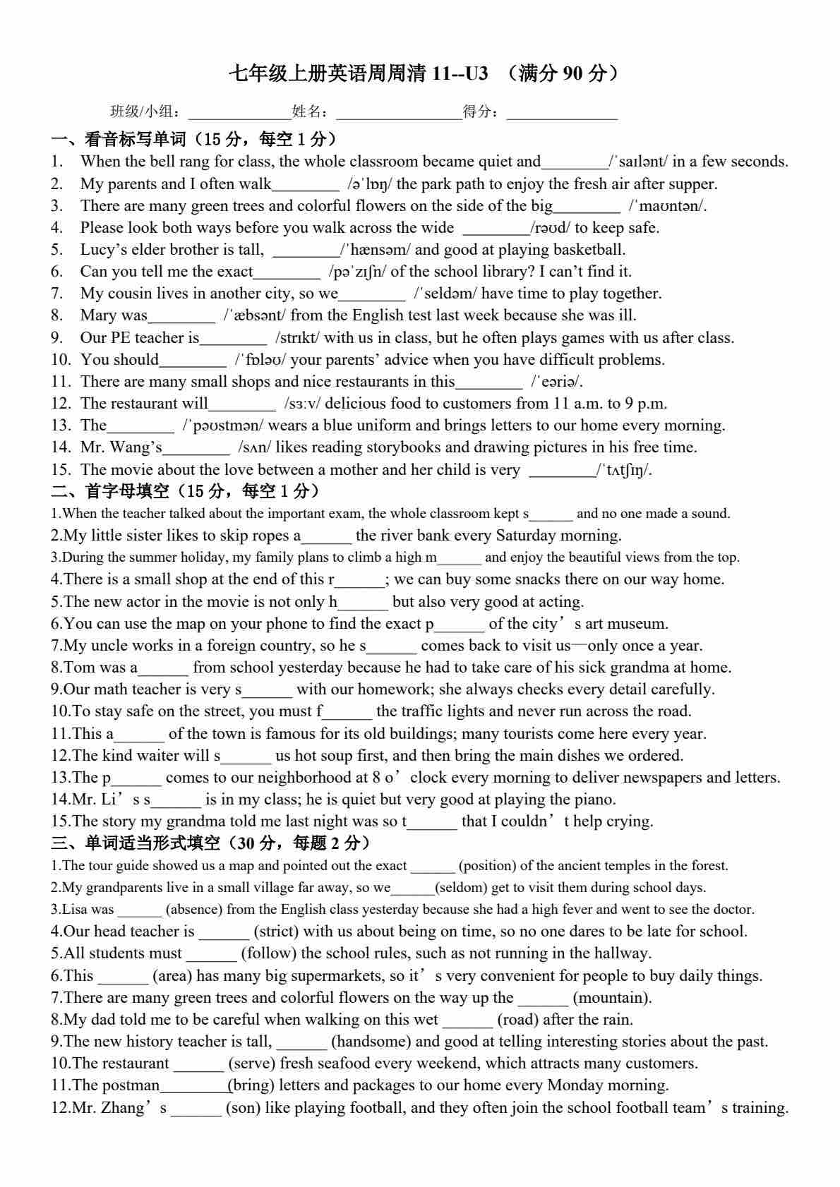 25秋外研七上英语练习题一一周周清11-Unit 3 Family ties(含答案)